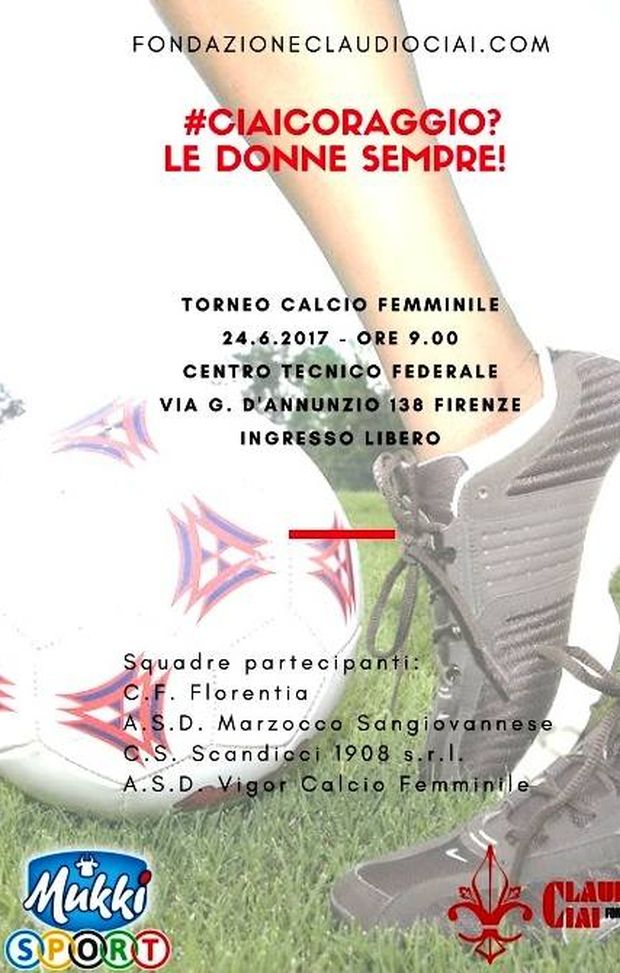 Sabato prossimo presso il Centro Tecnico di Coverciano con inizio alle ore 9 si terrà l'evento "#CIAICORAGGIO? LE DONNE SEMPRE!" legato al concorso Mukki Sport e promosso dalla Fondazioneclaudiociai.com che, proponendo questo torneo dedicato al calcio femminile, è riuscita ad ottenere la sponsorizzazione dalla Mukki che sarà anche presente con uno stand per offrire i proprio prodotti ai partecipanti. L'evento ad ingresso libero è condotto da Gaetano Gennai e la premiazione sarà tenuta delle ragazze della Fiorentina Women's
