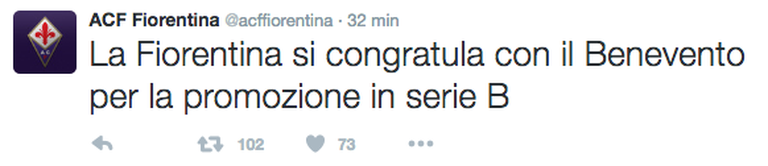 Aggiornamento: dopo circa un'ora e mezzo, e numerosi commenti da parte dei propri follower, la Fiorentina ha cancellato il tweet sul Benevento e postato il seguente messaggio: