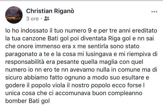 Nel giorno del compleanno di Gabriel Omar Batistuta, arrivano via facebook anche gli auguri di Christian Riganò: "Io ho indossato il tuo numero 9 e per tre anni ereditato la tua canzone Bati gol poi diventata Riga gol e non sai che onore immenso era per me sentirla. Sono stato paragonato a te e la cosa mi lusingava e mi riempiva di responsabilità era pesante quella maglia con quel numero, io non ero te non avevamo nulla in comune ma di sicuro abbiamo fatto ognuno a modo suo esultare e godere il popolo viola, il nostro popolo ecco forse l'unica cosa che ci accomunava. Buon compleanno bomber Bati gol"