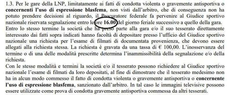 A riguardo, leggendo l'articolo 35 del codice di giustizia sportiva, scopriamo che "limitatamente ai fatti di condotta violenta o gravemente antisportiva o concernenti l’uso di espressione blasfema, non visti dall'arbitro, che di conseguenza non ha potuto prendere decisioni al riguardo, il Procuratore federale fa pervenire al Giudice sportivo nazionale riservata segnalazione entro le ore 16.00 del giorno feriale successivo a quello della gara (ovvero oggi, ndr)". La segnalazione sarà arrivata? Ancora un po' di attesa e ne sapremo di più. Qua sotto l'estratto del regolamento:
