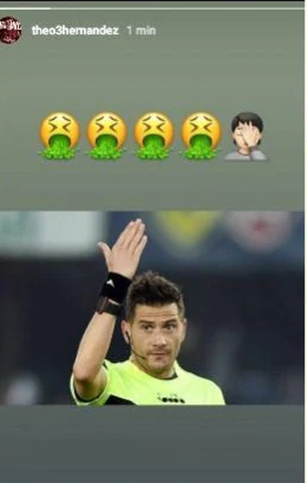 Un'immagine prontamente rimossa, ma che ha fatto in tempo ad essere catturata. Theo Hernandez, terzino del Milan prossimo avversario della Fiorentina, ha postato nelle proprie Instagram Stories una foto dell'arbitro Pasqua con alcune emoji che vomitano e un facepalm, una critica plateale per la mancata assegnazione del calcio di rigore per il contatto in area tra lui e Bakayoko nel finale di Milan-Napoli. Rebic si è fatto espellere, ma potrebbe non essere l'unico calciatore a saltare la Fiorentina per squalifica...