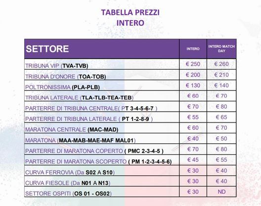 Sono già acquistabili i tagliandi validi per assistere dagli spalti del Franchi a Fiorentina-Milan, gara valida per 36esimo turno di Serie in programma per sabato 11 maggio (ore 20:30). Questo il tariffario pubblicato dalla società gigliata sul sito Violachannel.tv:
