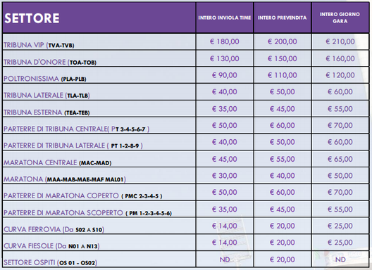 Si va dai 20 euro delle Curve ai 200 euro della Tribuna Vip