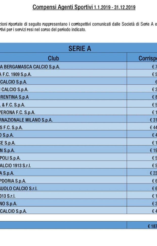Come tutti gli anni, sul sito della Figc troviamo la tabella cumulativa per club con le somme corrisposte a procuratori ed intermediari. Il periodo di riferimento è il 2019, quindi, nel caso della Fiorentina, 5ª in Serie A con i suoi 8,6 milioni di euro in commissioni, alle spalle di Juventus, Inter, Roma e Milan, si prendono in considerazione sia l'ultima campagna acquisti di Corvino che la prima di Pradè dal ritorno in viola.