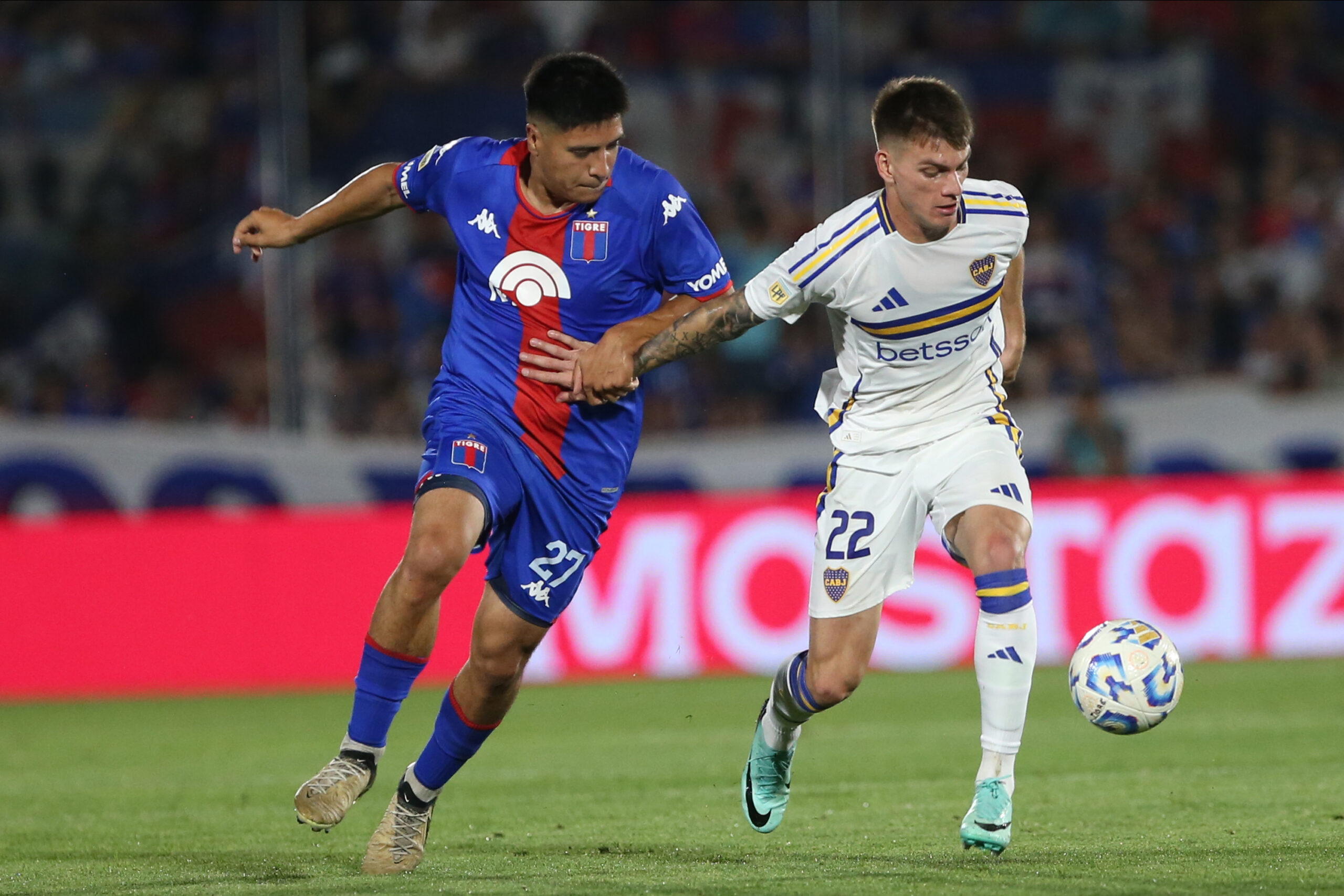 BUENOS AIRES, ARGENTINA - OCTOBER 19: Santiago Gonzalez of Tigre fights for the ball with Kevin Zenon of Boca Juniors during a Liga Profesional 2024 match between Tigre and Boca Juniors at Estadio Monumental de Victoria on October 19, 2024 in Buenos Aires, Argentina. (Photo by Daniel Jayo/Getty Images)