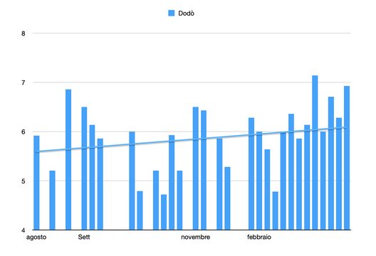 Discorso invece opposto per Dodò arrivato 'arrugginito' da uno stop provocato dalla sanguinosa invasione della Russia in Ucraina. La sua ultima partita con lo Shakhtar Donetsk risaliva all'11 dicembre 2021. Poi la consueta pausa e l'invasione russa che lo ha portato anche un po' in ritardo a Moena con 7 mesi di stop sulle gambe. Inizio incerto poi una bella partita contro il Napoli altre due sufficienze e poi uno stop per infortunio e una ripresa molto faticosa in cui Dodò ha raggiunto la sufficienza solo una volta fino ad arrivare alle belle prove di novembre e a quelle fornite nelle ultime 9 gare che come si vede chiaramente dal grafico sottostante sono molto positive con un'eccezione. La tendenza del suo grafico risulta ovviamente in ascesa come il suo rendimento.