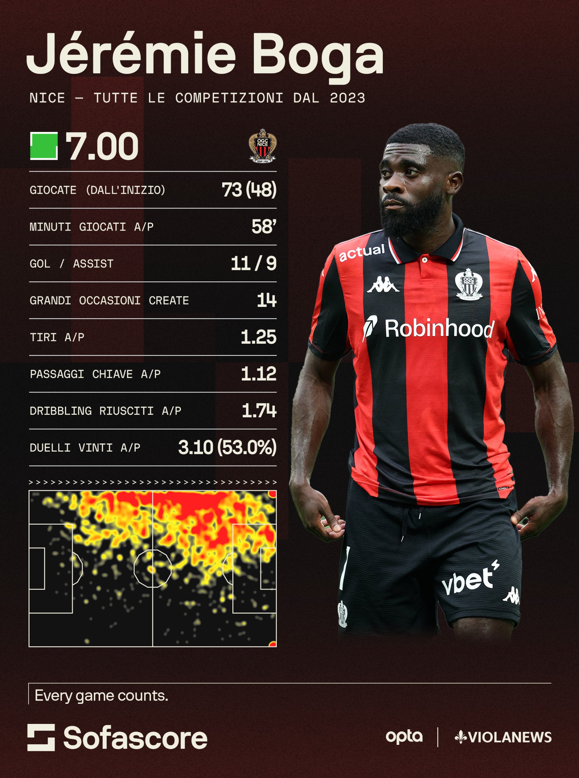 La nostra redazione ha raccolto con l'aiuto di Sofascore i numeri di Jeremie Boga con la maglia del Nizza in queste 2 stagioni abbondanti, dall'estate del 2023. L'esterno ha giocato 73 gare, 48 dal primo minuto, mettendo a segno 11 gol e 9 assist (distribuiti in maniera abbastanza equa). In risalto sono i contrasti vinti, più del 53%, ma per il resto non si parla di stagioni esaltanti, anche per i rossoneri in generale. Firenze, che sta vivendo il periodo più complicato della sua storia, potrebbe essere la piazza del suo rilancio. Per lui che, con Vincenzo Italiano in panchina, poteva già vestire la maglia della Fiorentina.