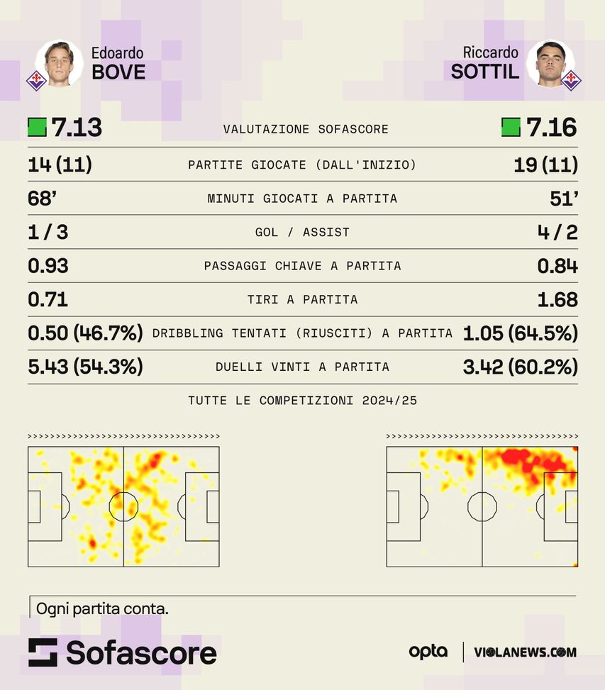 Se Bove era interpretava il ruolo di esterno sinistro con caratteristiche e compiti particolari, diverso è il rendimento di Riccardo Sottil. Classico esterno d'attacco, il numero 7 della Fiorentina ha capacità di dribling e di finalizzazione (che sta finalmente iniziando ad esprimere con efficacia) anche superiori a Bove. Ma il suo apporto in interdizione, il suo aiuto al centrocampo e alla difesa è chiaramente inferiore. I dati che vedete nella tabella di sofascore.com si riferiscono all'intera stagione in corso (dati medi a partita). Ma basta il colpo d'occhio delle due heatmap per rendersi conto della differenza.