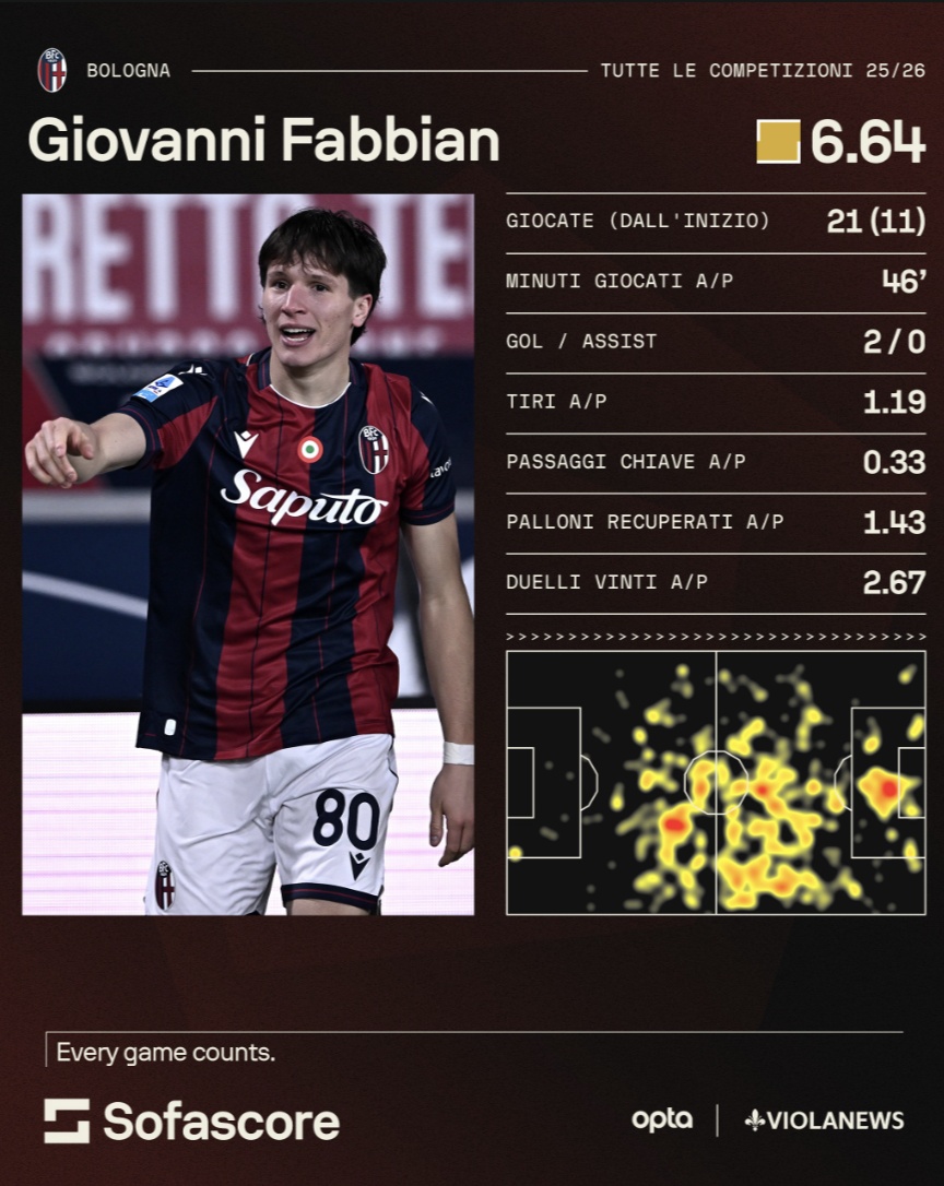 —Dal punto di vista tattico e fisico, Giovanni Fabbian si presenta come un profilo ben definito. Alto, longilineo e strutturato, il classe 2003, inizialmente interno tra giovanili dell'Inter e Reggina, ha costruito gran parte del suo percorso in Serie A agendo da trequartista alle spalle della punta, ruolo in cui può esaltare al meglio tempi di inserimento e presenza offensiva. Non è un rifinitore statico né un giocatore che vive tra le linee per accumulare palloni, ma piuttosto un centrocampista offensivo dinamico, che attacca l’area con continuità e intelligenza. La sua heatmap di Sofascore racconta proprio questo: una zona d’azione prevalentemente centrale, ma con frequenti incursioni negli ultimi sedici metri, a testimonianza di compiti chiari di inserimento e occupazione dello spazio più che di pura regia avanzata.