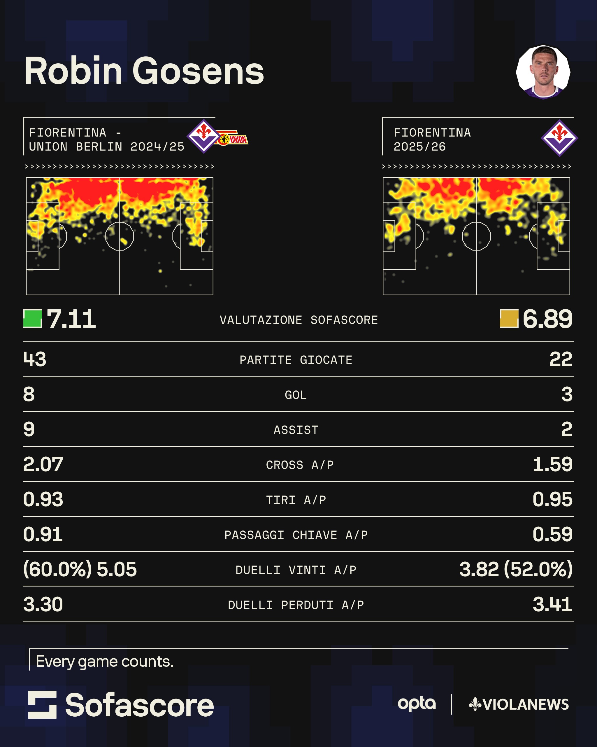 —Ai tempi dell'Atalanta Gasperini ha fatto scoprire all'Europa intera un giocatore dominante fisicamente. Una forza impressionante nelle gambe, unita ad un'abilità quasi unica nei duelli. A Firenze è arrivato un giocatore con qualche acciacco in più, ma ancora decisivo. Palladino ha sfruttato alla perfezione i suoi tempi di inserimento in area, e la sua capacità di dominare sui terzini avversari negli ultimi metri. Con l'inizio della nuova stagione i numeri sono calati drasticamente. Pioli voleva una Fiorentina più tecnica, con le richieste per Gosens che sono cambiate. Meno spinta, meno incursoni, meno gol. Poi ci si è messo di mezzo l'infortunio, che ha tenuto fuori l'ex Union per diverse settimane. Qui potete vedere l'analisi dei suoi numeri, riportata da Sofascore.
