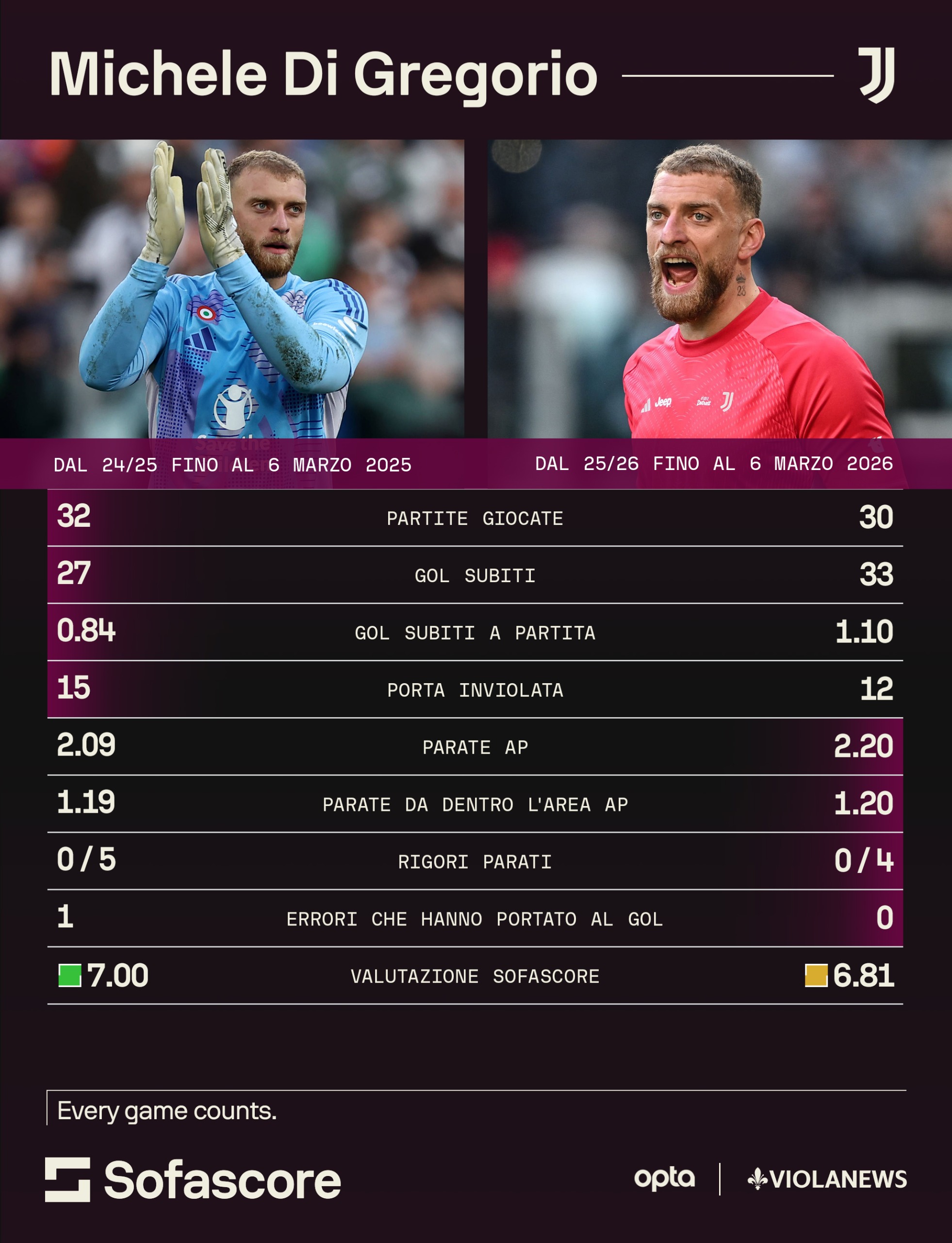Indubbiamente, il portiere ex Monza ha mostrato incertezza quest'anno, soprattutto in tre situazioni: quella di Couto contro il Borussia Dortmund in Champions League, quella con Luis Henrique a San Siro contro l’Inter e Vojvoda allo Stadium contro il Como. Tra campionato e Champions è costato alla Juventus 9 punti. Se nella passata stagione il suo rendimento era assolutamente positivo (ad inizio 2024/25, con Thiago Motta in panchina, ha fatto anche una sfilza di clean sheet interrotta solo dall'infortunio di Bremer a Lipsia in Champions), quest'anno anche un dato non lo favorisce particolarmente, pur facendo notare che non sempre la colpa è sua: sul primo tiro in porta, in questa stagione, la Juventus ha preso gol ben 13 volte.