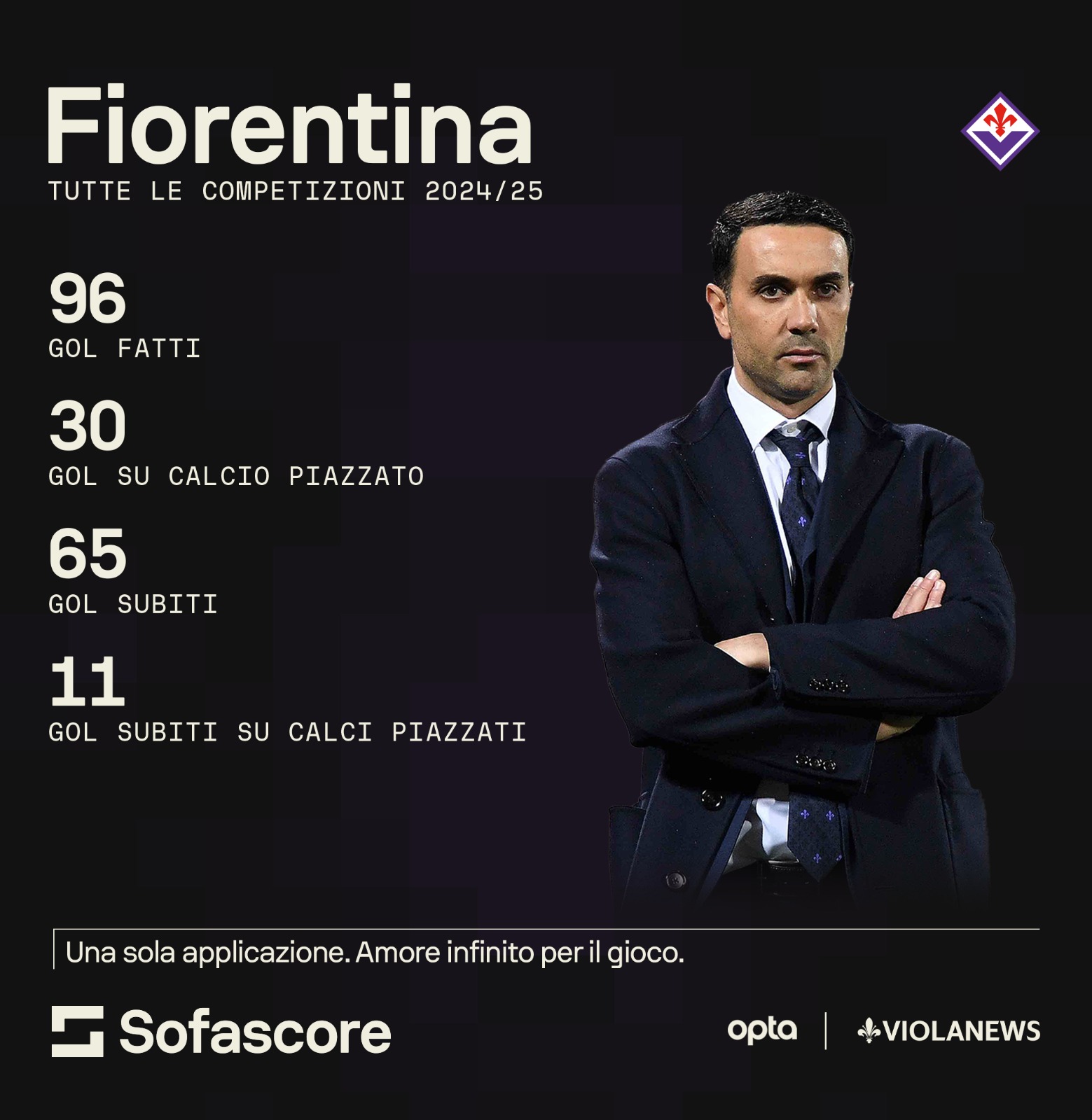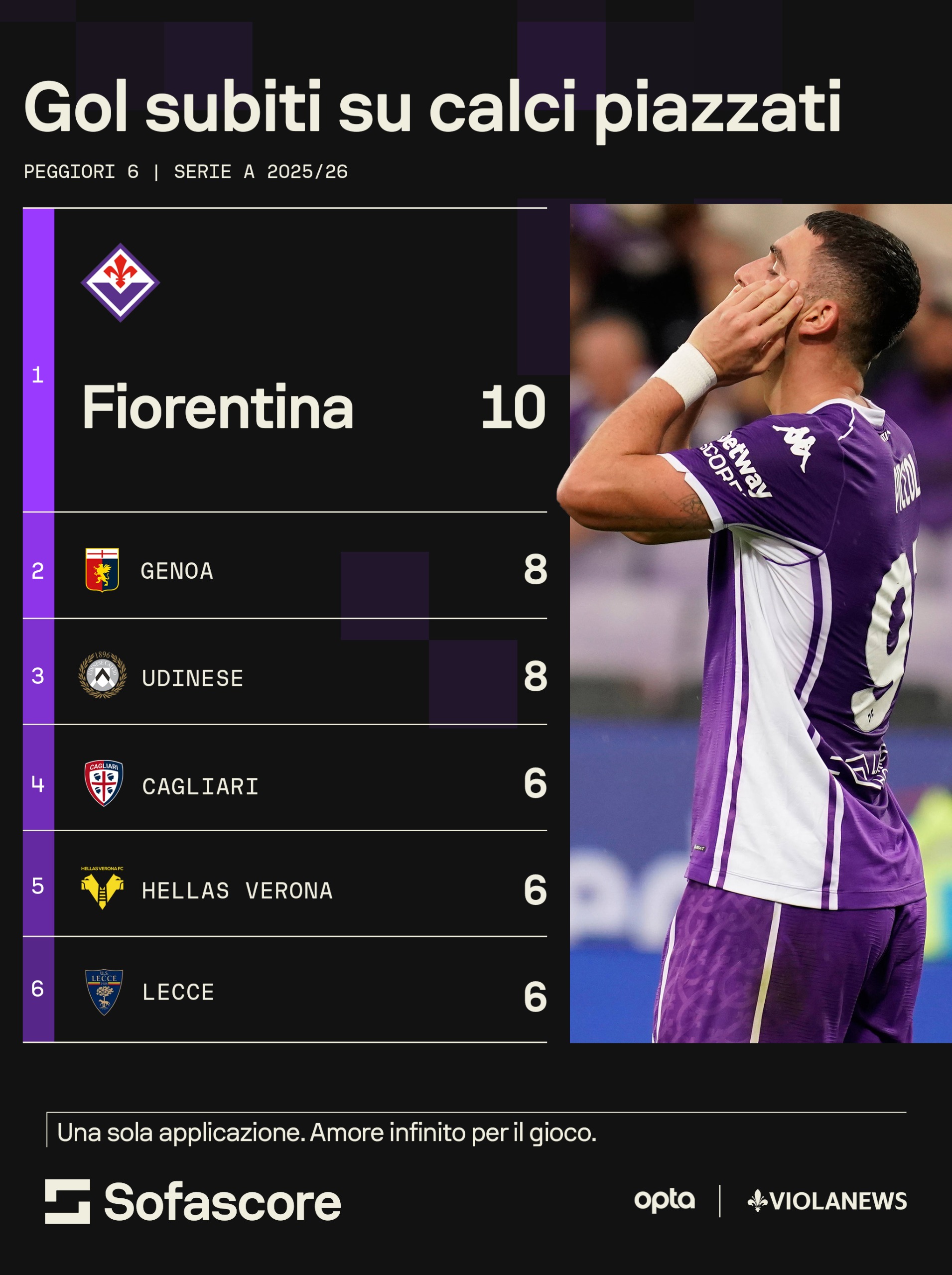 “I gol presi sulle palle inattive li avevo visti anche io prima della partita: infatti siamo passati a uomo dalla zona, ma sulla linea non ho avuto il tempo di lavorare, ho cercato di dare più compattezza”. Queste le parole del tecnico ieri a Dazn, dopo l’ennesimo gol subito su palla ferma. Quello di Ostigard è addirittura il decimo in sole undici partite. Numeri preoccupanti, che fanno della Fiorentina la squadra in Serie A che ha subito più gol da palla inattiva, come mostra la card degli amici di Sofascore: alle sue spalle ci sono Genoa e Udinese a 8, Cagliari, Verona e Lecce a 6. Tradotto: la Fiorentina inizia quasi tutte le sue partite sapendo che prenderà un gol in questo modo.