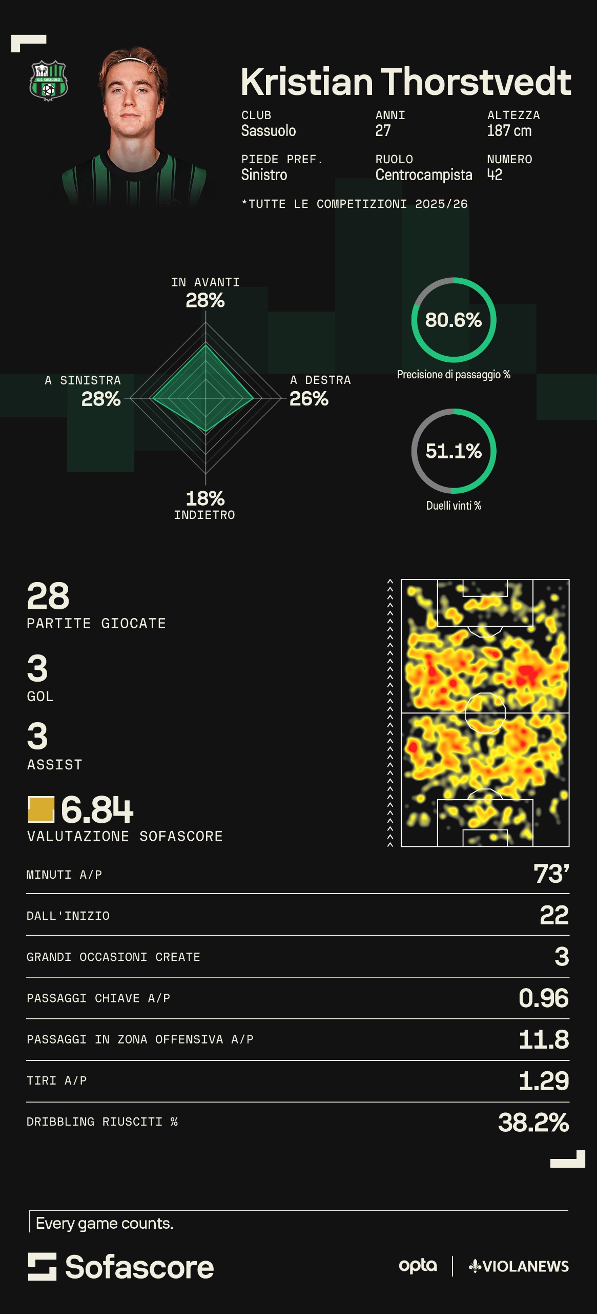 Il giocatore norvegese, classe 1999, è in Italia dall'estate 2022 e questa del ritorno in Serie A col Sassuolo è stata indiscutibilmente la stagione del salto di qualità. In 28 presenze (con la Coppa Italia ndr) è andato in gol 3 volte, servendo altrettanti assist. A dispetto di un fisico non propriamente longilineo (187 cm) il mediano mancino eccelle nello svolgere i compiti di entrambe le fasi, come dimostra la heat map e gli altri dati elaborati da Sofascore.