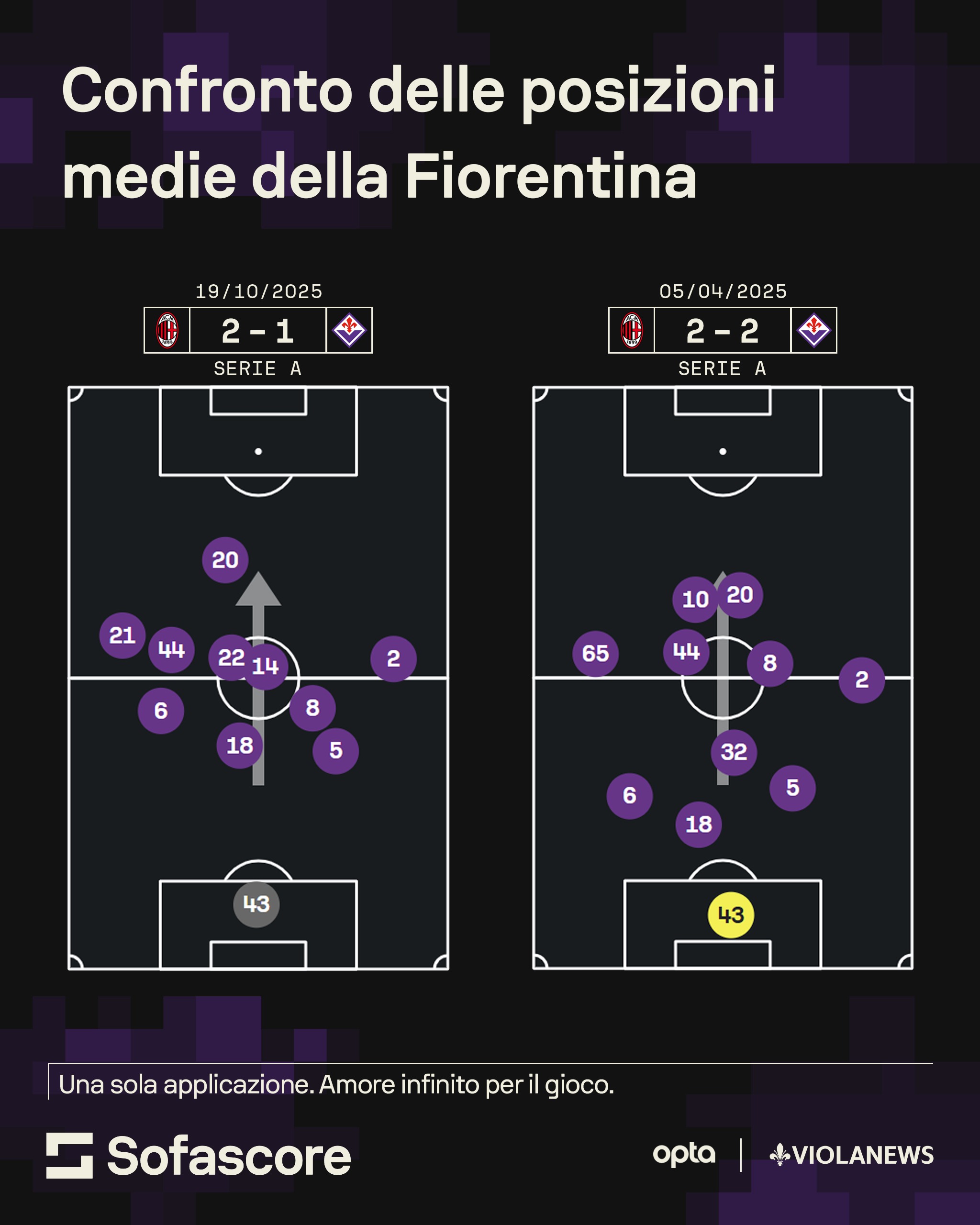 Pioli ha dovuto prendere atto della situazione: il calcio che aveva in mente per la sua nuova Fiorentina non è praticabile al momento. E allora cosa fare? Visto che per nove o dieci undicesimi la formazione titolare è la stessa dell'anno scorso, la soluzione più immediata è quella di tornare ai vecchi automatismi. Resettare, insomma, ricominciare da quello che fino a maggio ha funzionato surrogando Cataldi con Nicolussi (non scontato ma nemmeno improponibile). Qualche timido miglioramento si è visto, però dopo tre mesi di lavoro in altre direzioni e un paio di settimane intensive per preparare la gara col Milan, a San Siro è scesa in campo una sorta di chimera tattica, risultato di una riduzione ai minimi termini da 3-4-2-1 a 3-6-1, appiattendo i due trequartisti (Fazzini-Fagioli) sui due mediani (Nicolussi-Mandragora). Vi facciamo vedere le posizioni medie del 2-2 dello scorso campionato, il 5 aprile, e quelle della gara di ieri, grazie a Sofascore, poi le commentiamo.