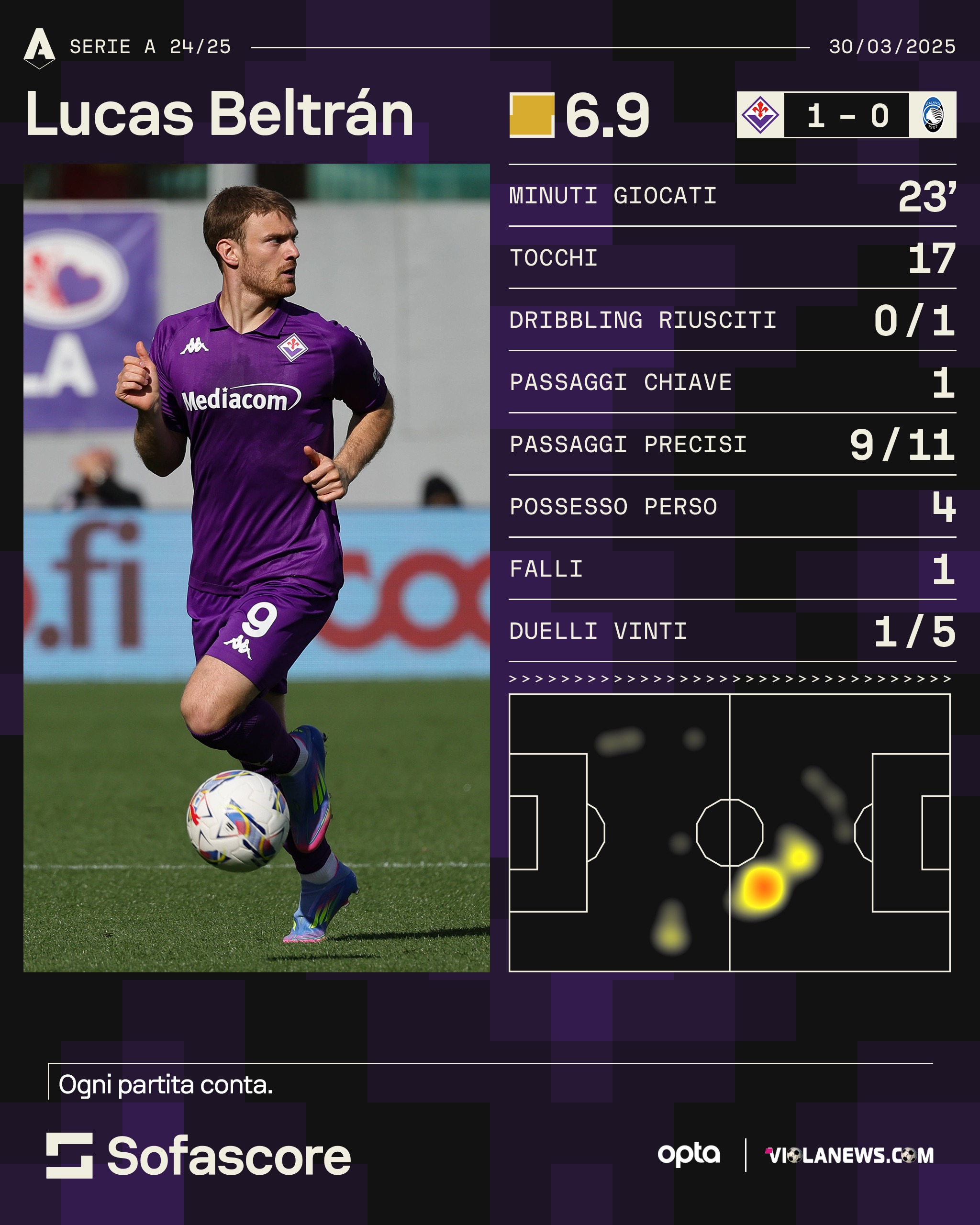 —In Inghilterra utilizzano il termine "super sub"(diminutivo di super substitute, super sostituto) per riferirsi ad un giocatore che entra e cambia il volto alla partita. Ecco, questo sembra proprio essere il ruolo cucito addosso a Beltran. Se è vero, com'è vero e come ha ammesso Palladino, che adesso è il momento della continuità finalizzata alla vittoria, ci dobbiamo aspettare sempre la stessa formazione salvo squalifiche o imprevisti come quello occorso domenica a Gosens. E allora Beltran avrà a volte il compito di dare un'alternativa a Gudmundsson, come contro l'Atalanta che è stata fatta a fette dai suoi passaggi filtranti (Ranieri quasi non se l'aspettava e si è mangiato il 2-0 su un servizio strepitoso, il passaggio chiave che vedete in grafica); altre volte invece, vedi Napoli-Fiorentina, entrerà per formare un tridente con il numero 10 e Kean e massimizzare la produzione offensiva sbilanciando lo schieramento. E poco male se il Vikingo non ha la giocata singola come gli altri due attaccanti ai quali parte dietro: il suo addendo alla formazione iniziale può dare la somma giusta per rendere perfetto questo finale di stagione.