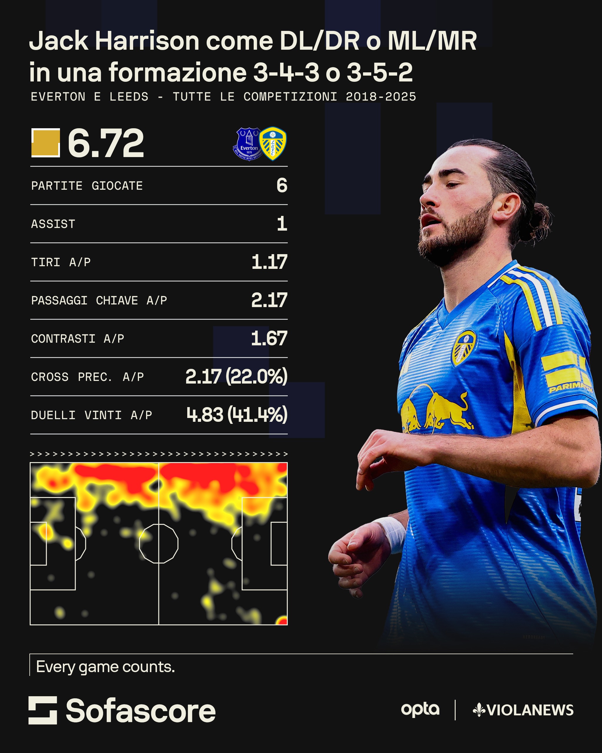 Magari non dal 1', ma Harrison a gara in corso, può diventare contro le più basse e coriacee difese un'opzione certamente interessante. Com'è successo, se andiamo all'indietro con la memoria fino al suo esordio, in casa contro il Cagliari, con un punteggio da provare a ribaltare. Da ricordare che la sua interpretazione del ruolo di esterno non è solo offensiva, ma anche difensiva. Ripiegamenti e corse all'indietro sono nel suo repertorio. Vanoli ne è consapevole e lo ha lanciato poi anche nell'esperimento (di squadra fallimentare) a Udine come laterale destro (non nella sua fascia favorita) nel 3-5-2. A sinistra magari può essere un'opzione nuovamente proponibile: vi facciamo vedere anche i dati delle 6 partite - già un numero più consistente rispetto a quelle da terzino puro - giocate da tornante di fascia in Inghilterra, sempre grazie a Sofascore: