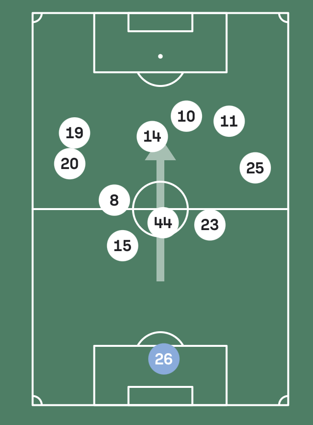 Il caso più recente risale al 26 agosto scorso, in EFL Cup, con la maglia del Leeds contro lo Sheffield Wednesday. In un 4-2-3-1, Harrison viene schierato terzino sinistro dal 1', ma l’interpretazione del ruolo è tutt’altro che difensiva: la sua posizione media è stabilmente oltre la metà campo, trasformando di fatto la linea arretrata in una difesa a tre. Un terzino “finto”, più simile a un esterno a tutta fascia. Nella mappa qui sottostante presa da Sofascore, ecco riportate le posizione medie dei giocatori del Leeds in quell'occasione (Harrison in grafica corrisponde al numero 20).