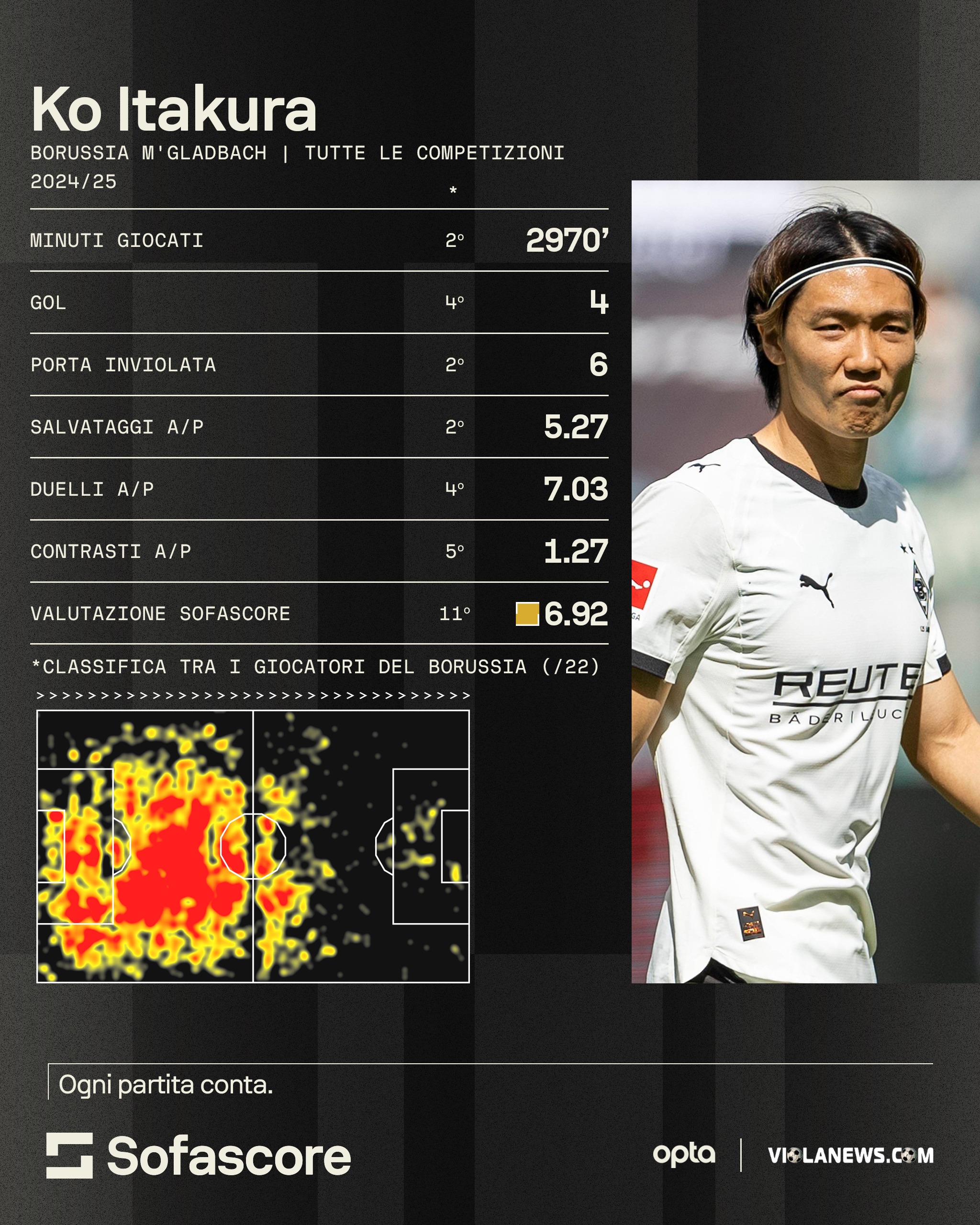 Itakura, classe 1997, è un centrale-centrale: è destro di piede, ma a quattro può giocare sia sul centro-destra, sia sul centro-sinistra; cosa ancor più interessante, nella linea a tre in questi anni con i Fohlen ha occupato la zolla centrale. Un giocatore di questo genere permetterebbe di formare finalmente quella coppia con Pablo Marì che manca al reparto viola, dato che Kospo è sempre stato impiegato a sinistra (dove ci sono già Ranieri e Viti) e che a destra ci sarebbero Comuzzo e Pongracic, quest'ultimo per ora accentrato alla bisogna come nel caso di Nottingham. Dall'infografica qua sopra possiamo anche vedere come Itakura sia estremamente continuo, dote innata alla maggior parte dei giapponesi, e segni anche parecchio per essere un difensore: 4 reti in un reparto che ha recentemente visto Pongracic lamentare la sua scarsa concretezza in area avversaria sarebbero ossigeno. Un baluardo, un difensore moderno che possa inserirsi al centro della difesa e far funzionare al meglio il meccanismo di Pioli: questo ha visto la Fiorentina in Itakura, questo cerca la società viola nelle ultime settimane di mercato.
