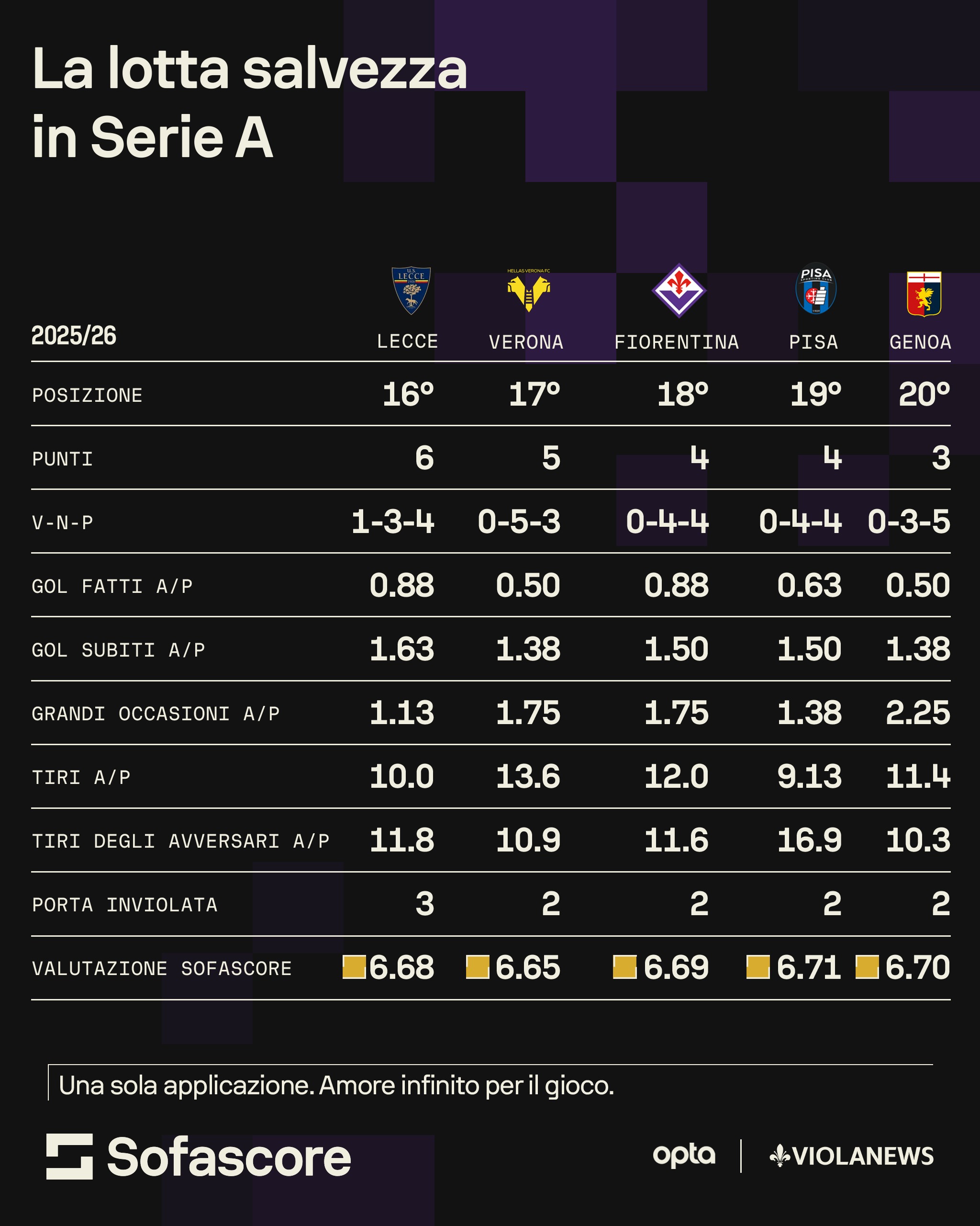 La Fiorentina non primeggia da sola in neanche una di queste voci. Il Lecce è l'unica delle cinque che ha assaporato la vittoria fin qui, e fa compagnia ai viola a quota 0,88 gol fatti a partita. Con la differenza che Pioli ha in canna un bomber da 25 reti nella scorsa stagione. Il Verona e persino il Genoa ultimo fanno meglio a livello di gol subiti a partita, e addirittura i rossoblù di Vieira, avversari il 9 novembre, creano una grande occasione da gol in più ogni due partite. Tiri a partita? Il Verona di Giovane e Orban fa meglio. Tiri concessi a partita? Battuti da Verona e Genoa. Le reti inviolate sono due, una di queste però contro il Pisa, che ha dati tutti peggiori, ma che avrebbe meritato di vincere quel pomeriggio alla Cetilar Arena. Sì, la Fiorentina in questo periodo storico gioca male, tanto male che il diciottesimo posto in classifica non appare, alla consultazione dei dati, un'anomalia. Lo è certo se si guarda ai nomi in rosa e al valore complessivo sulla carta: sta alla guida tecnica e alla società risolvere questa dissonanza, prima che il tempo, da tanto, diventi poco.