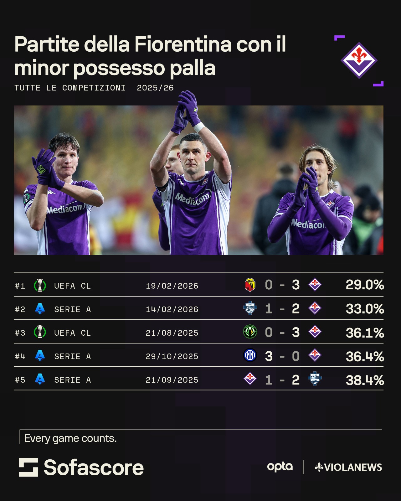 Ma la cosa ancor più interessante è che la seconda partita per minor possesso palla giocata quest'anno e che ha fatto registrare il 33% è Como-Fiorentina giocata sabato scorso. E la terza? Polyssia-Fiorentina, 0 a 3 con il 36,1% di possesso palla. Si tratta di dati piuttosto curiosi, che possiamo leggere sulla card preparata dagli amici di Sofascore. Forse allora non serve scegliere tra Jedi e Sith, tra dogmi del gioco e culto del risultato. La sensazione è che la Fiorentina, terminata la ricerca ossessiva del controllo, abbia trovato una via più pragmatica. Meno luminosa, forse, ma più efficace. Non sarà il calcio che fa innamorare i puristi, ma in una stagione così, se la Forza porta punti, qualificazioni e un po’ di serenità, tanto vale seguirla. Anche se il possesso palla resta dall’altra parte della galassia.