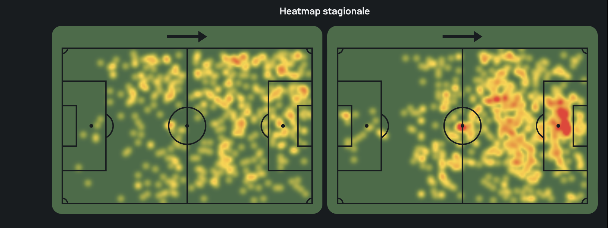 Anche i dati della Serie A vanno in questa direzione. Kean ha segnato 8 gol in 2047 minuti, con un xG (gol attesi) di 15.06 e ben 18 grandi occasioni sprecate. Bonny, pur giocando appena 904 minuti, ha segnato 5 reti con un xG di 3.24, producendo anche 3 assist e 6 grandi occasioni create. Kean tira molto di più, attacca la profondità e vive per il gol. Bonny partecipa di più al gioco, lega i reparti e rende meglio accanto a una punta fisica. Lo si vede perfettamente nelle heat-map (di Sofascore) di entrambi i calciatori (a destra Kean, a sinistra Bonny).