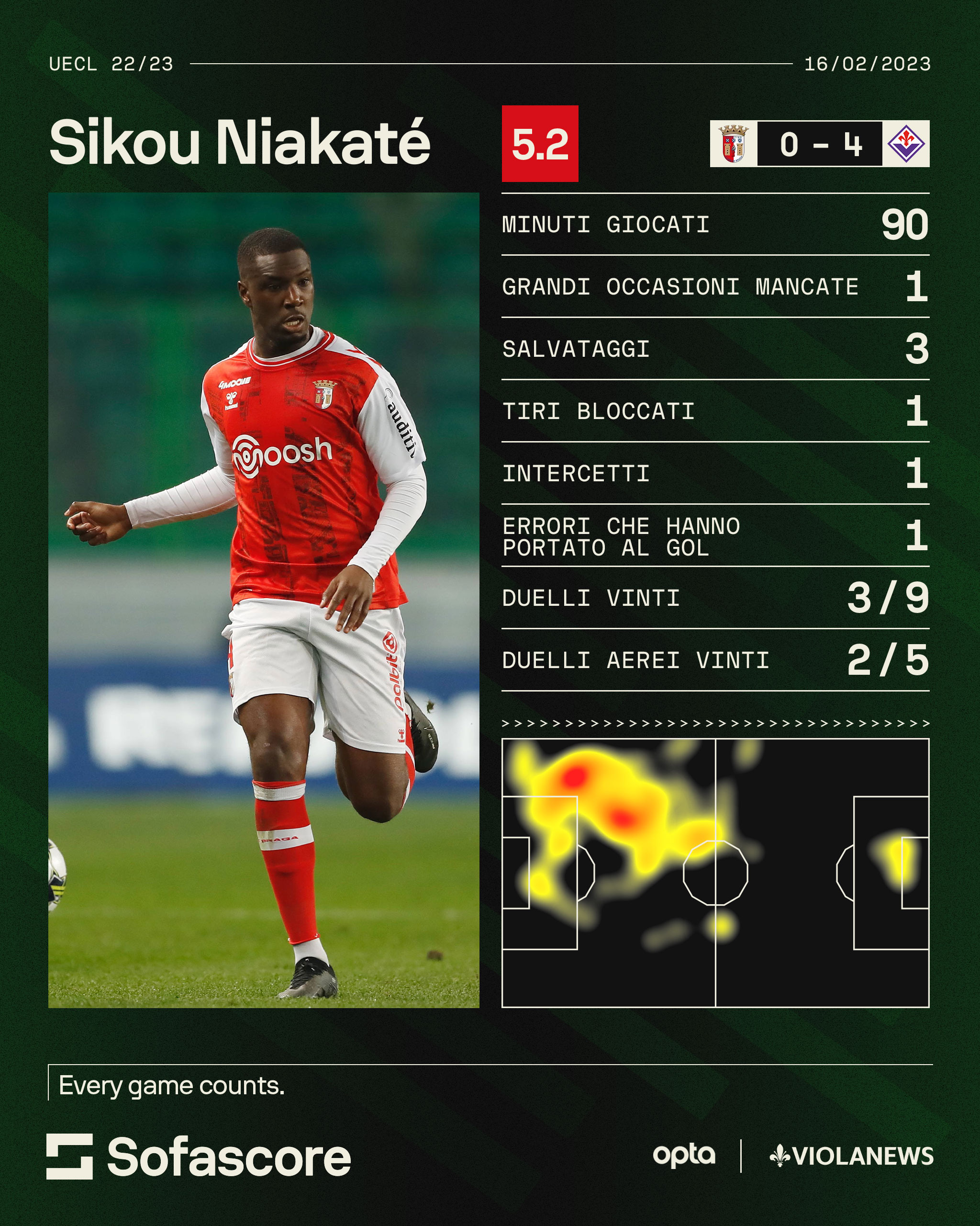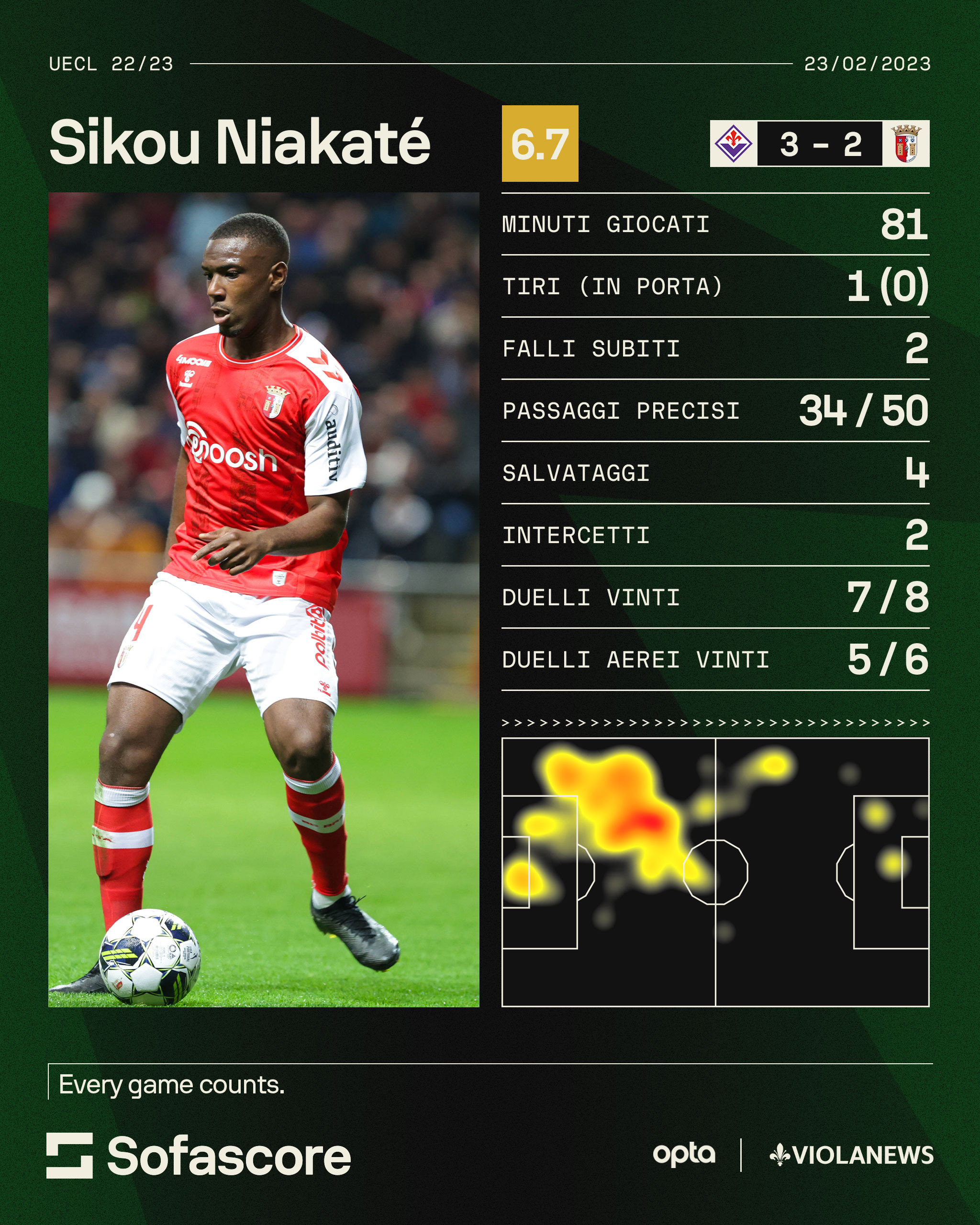 Non è questo, però, il caso: ad una rapida scorsa della sua carriera, troviamo che Niakaté è al Braga dal 2022, dopo una crescita in Francia tra Valenciennes, Guingamp e Metz, quindi la lampadina si è accesa. Vuoi vedere che era in campo già per i playoff di Conference League 2022/23 vinti dalla Fiorentina proprio sui portoghesi?