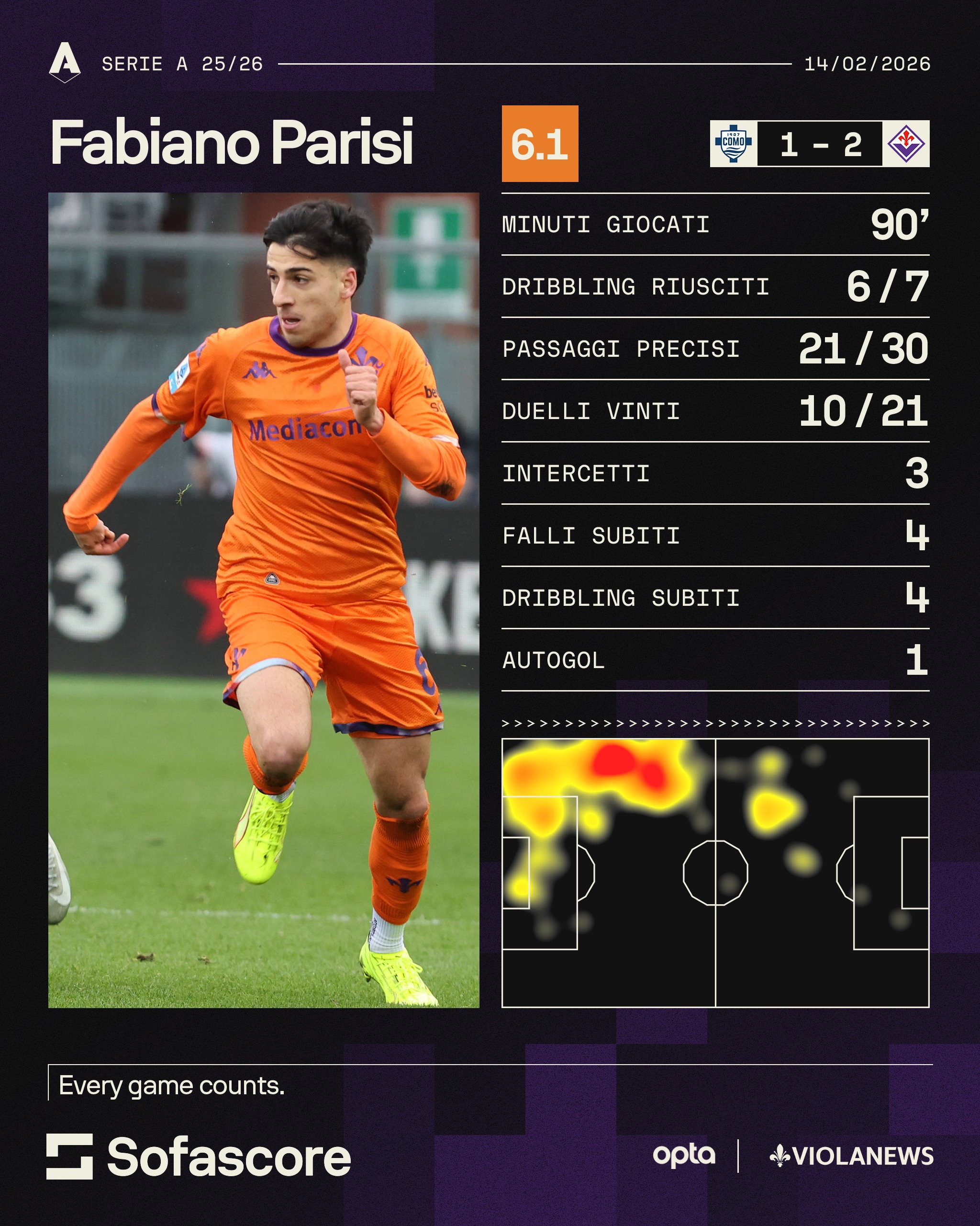 —Parisi ha garantito equilibrio tra difesa e centrocampo, facendosi trovare pronto anche nelle transizioni offensive. Una prestazione completa, da giocatore maturo e consapevole, capace di interpretare entrambe le fasi con intensità e qualità. In viola non aveva mai avuto questo rendimento e la continuità di prestazioni che garantisce da inizio 2026. Ancora più clamoroso pensare che il suo momento d'oro sia coinciso con l'impiego fuori ruolo.