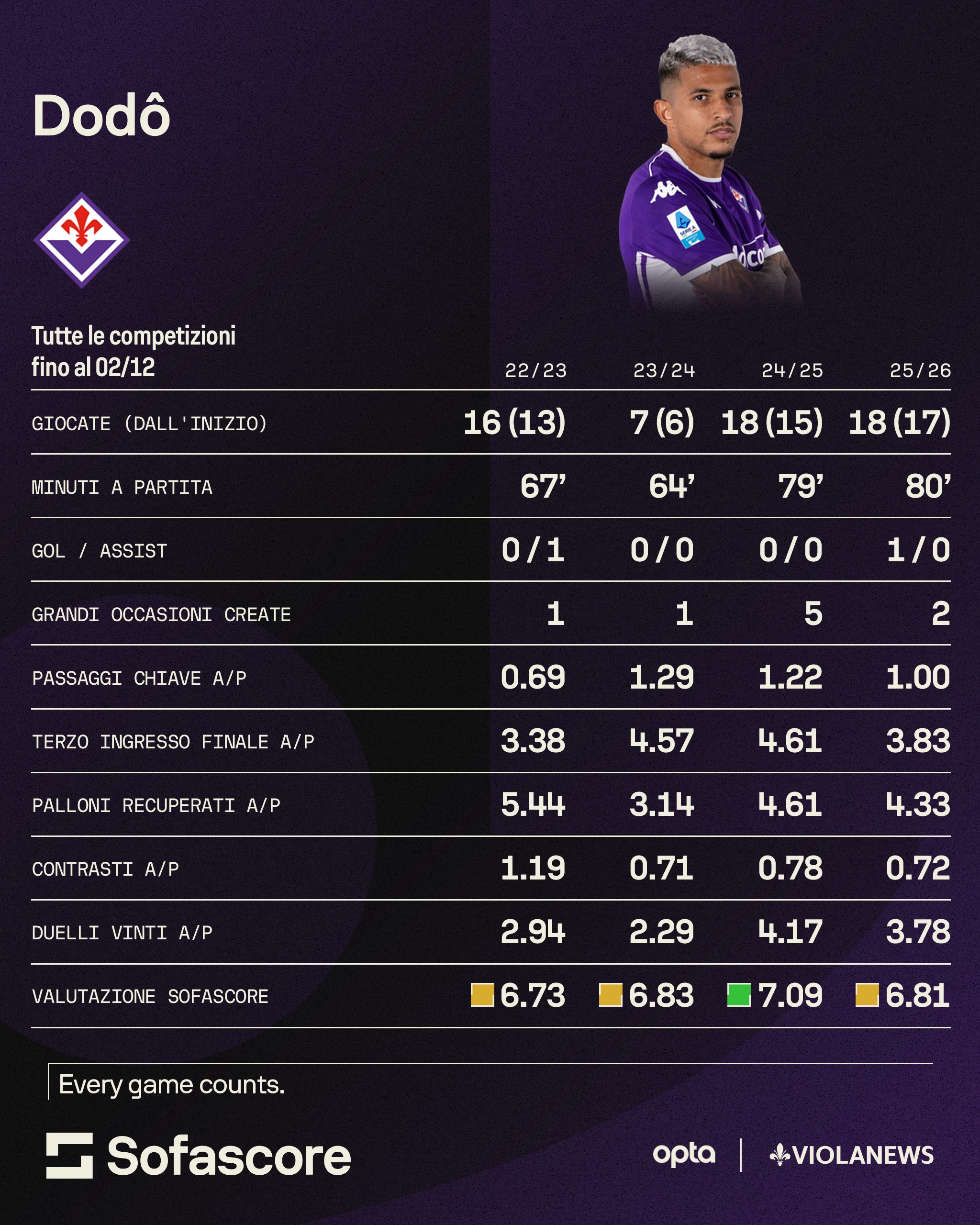 Il 2023/24 ha visto un grave infortunio, che ha quasi annullato la stagione di Dodò, ma le altre due stagioni complete recitano 1 gol (quello alla Samp nel 5-0 del 30 aprile 2023) e 4 assist la prima e appunto 6 assist la terza. Alla data del 2 dicembre, Dodò non ne aveva fatto nemmeno uno su sei, nonostante le 7 vittorie consecutive con Palladino, e anche nella prima stagione mancavano ancora il gol e 3 dei 4 assist finali, ma sono i dati che inchiodano il brasiliano. Meno passaggi chiave, meno ingressi nel terzo finale di campo, meno grandi occasioni create, anche se in questo, come si vede nell'infografica di Sofascore, non è mai stato un drago.