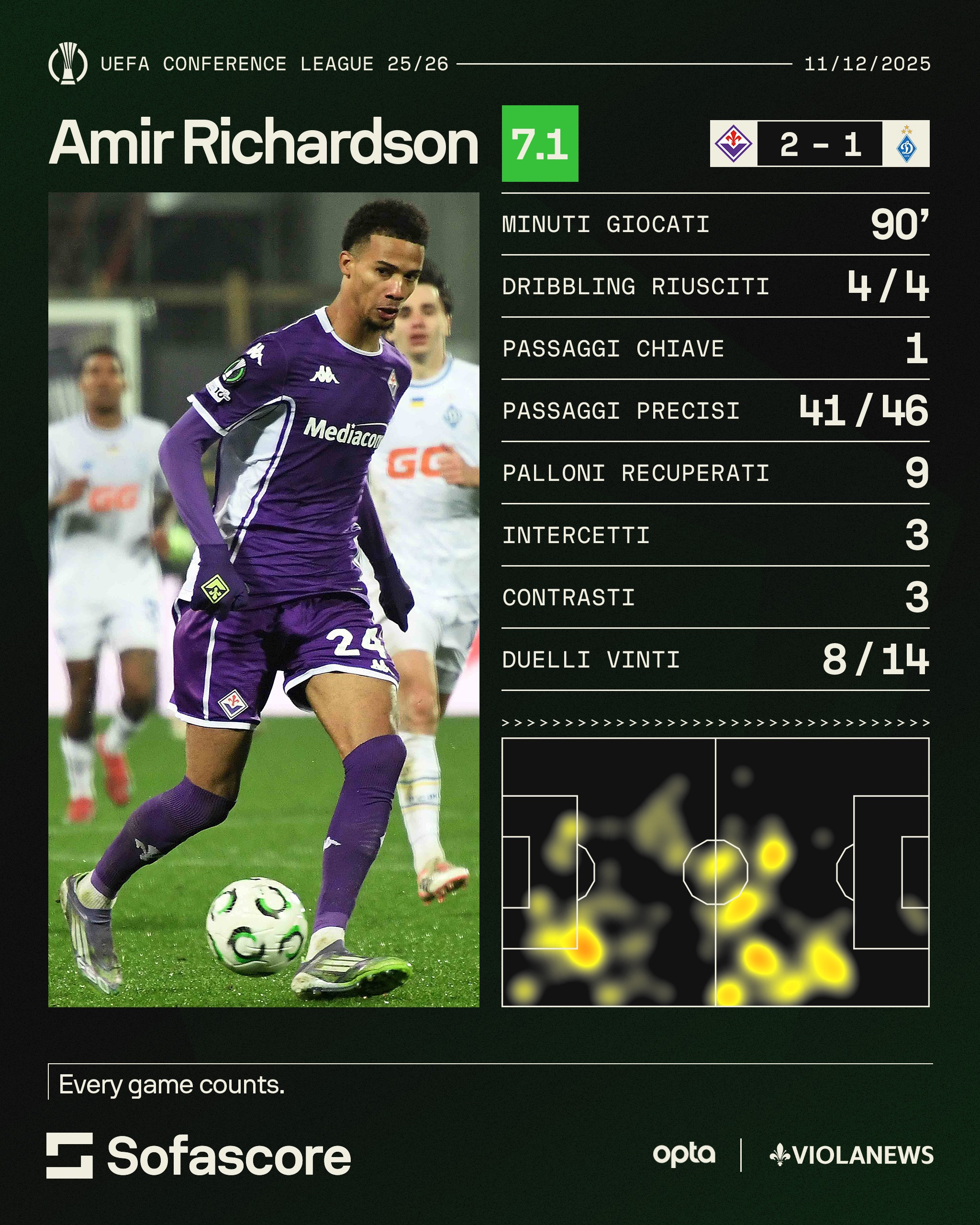 11 minuti. Non è solamente il titolo del romanzo di Paulo Coelho, ma il tempo che aveva complessivamente giocato in stagione Amir Richardson prima della sfida contro la Dinamo Kiev. Il marocchino è stato la grande sorpresa alla lettura delle formazioni ufficiali in una partita fondamentale nell'ottica di superare il girone di Conference League. E visto il poco spazio concessogli, qualcuno si stava forse anche dimenticando che il classe 2002 fosse ancora in rosa. Arrivato dal Reims per circa 10 milioni di euro, il ragazzo ha vissuto una stagione d'ambientamento sotto la guida tecnica di Raffaele Palladino, e in tanti si aspettavano una crescita già a partire dai mesi estivi. In realtà Richardson, fra problemi fisici e familiari, è scivolato rapidamente in fondo alle gerarchie diventando un vero e proprio desaparecido con Stefano Pioli. Fino all'arrivo del nuovo allenatore.