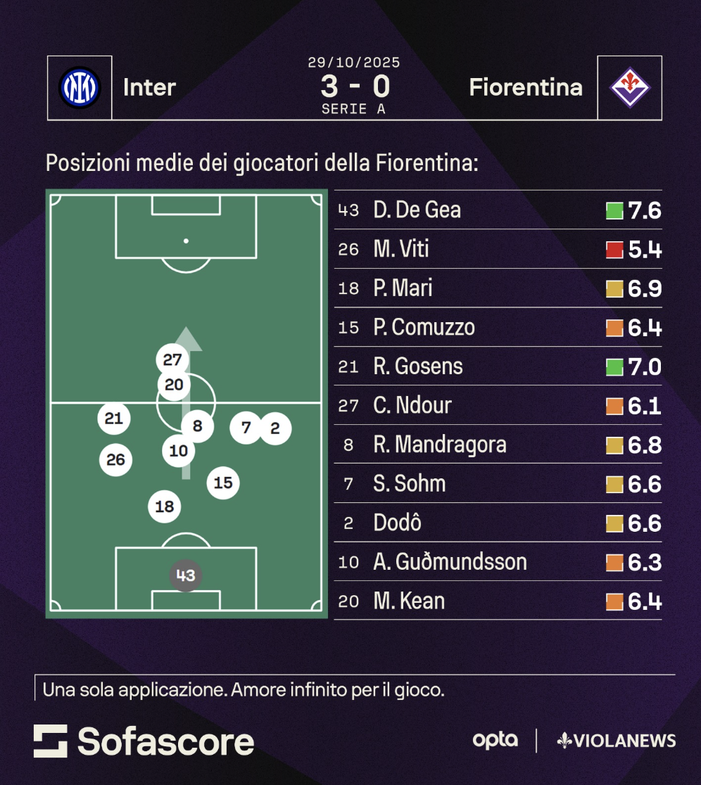 Non è un caso infatti se il primo gol dell'Inter è avvenuto appena quattro minuti dopo l'uscita dal campo di Albert Gudmundsson al quale Pioli aveva affidato un compito difensivo non da poco: essere l'ombra di Calhanoglu. E l'islandese ha eseguito alla perfezione la richiesta del tecnico ritrovandosi più volta al limite della propria area di rigore a recuperare palloni. Da ciò deriva il dato sul baricentro della Fiorentina nella sfida di ieri sera: 45,7 metri dalla porta di De Gea. Come mostrano le posizioni medie nelle rilevazioni di Sofascore, Gudmundsson, che dovrebbe stare alle spalle di Kean, si trova addirittura dietro Mandragora in una posizione da mediano. Senza contare poi che il giocatore più offensivo della Fiorentina è risultato Ndour. Nel titolo abbiamo citato il film di Terry Gilliam del 1998, con San Siro al posto di Las Vegas, ma magari i numeri 10 e 27 viola avessero lo stesso carisma di Johnny Depp e Benicio Del Toro.