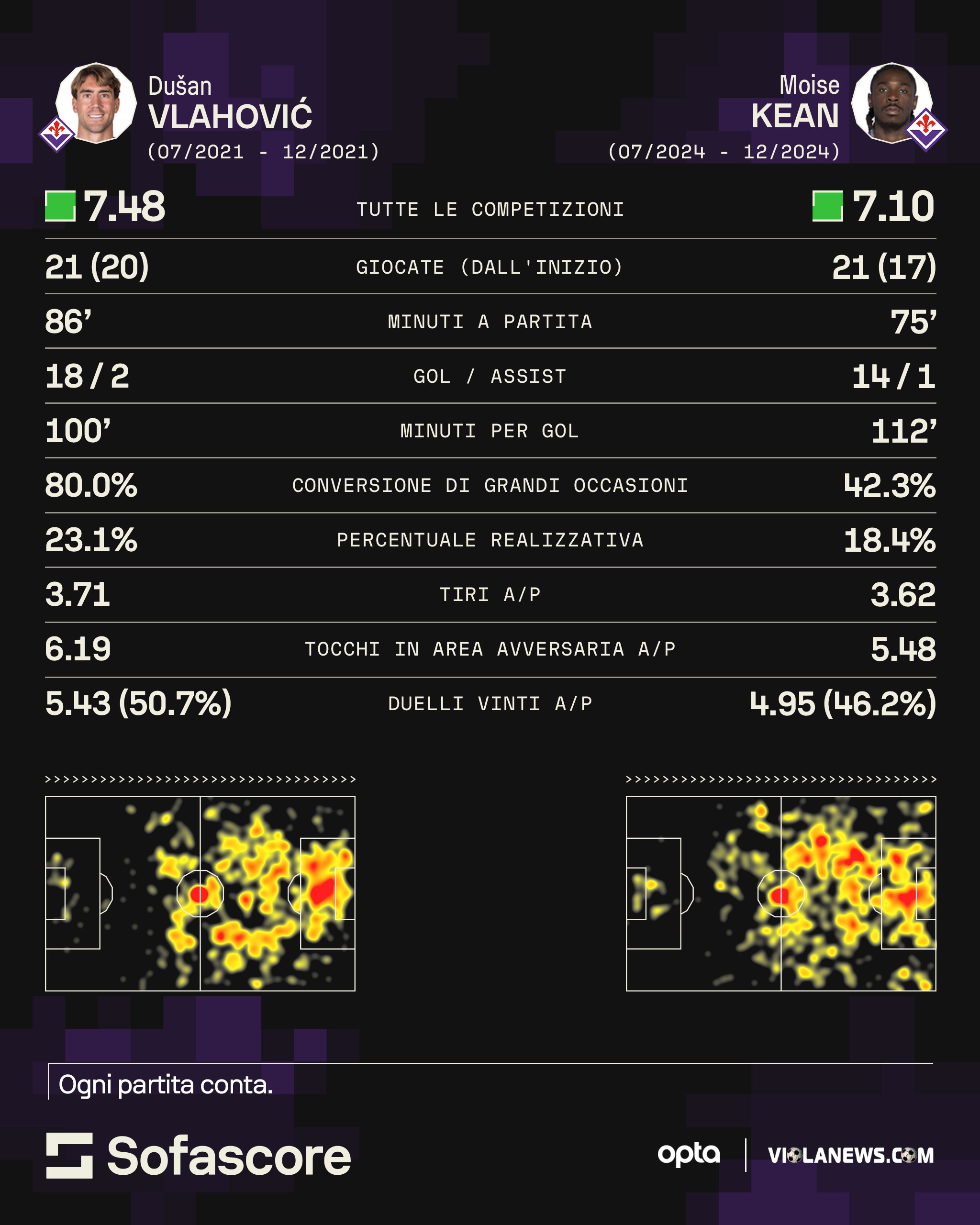 Arrivato non certo con l’entusiasmo della piazza data la stagione da 0 reti dell’anno scorso, Kean ha saputo mettere a tacere i mugugni a suon di reti e non solo. E pensare che la stagione non era iniziata proprio al top, né per lui né per i viola, soprattutto quando la modesta Puskas Akadémia gelò il Franchi nella torrida serata del 22 agosto bloccando i gigliati sul 3-3. In quell’occasione Kean segnò il suo primo gol al Franchi con la Fiorentina, ma non convinsero certo né lui né la squadra. Ed anche in campionato nelle prime partite contro Parma e Venezia faticò non poco, provando a sgomitare con le difese avversarie ma senza riuscire ad incidere anche a causa del mancato appoggio della trequarti. La sostanza, però, già si intravedeva, ed a partire dal gol da opportunista ed attaccante vero contro il Monza il primo settembre e da quello successivo contro l’Atalanta alla ripresa dopo la sosta-nazionali, Kean ha acquisito sempre più fiducia dalla piazza e da Palladino, diventando il perno attorno a cui ruota la fase offensiva gigliata. Il punto più alto toccato sin qui, forse, rimane la doppietta e la prova totale messa in campo nel 5-1 contro la Roma, anche se merita di essere citata la tripletta messa a segno contro il Verona il 10 novembre. Non sono mancati, certo, anche i momenti no, come quando in Coppa Italia, pur segnando, ha sbagliato un gol clamoroso di testa da pochi cm dalla porta per poi sparare in curva il proprio tentativo alla lotteria dei rigori, ma quel che emerge ad ora è l’estrema importanza di Kean all’interno dei meccanismi viola, anche quando dalla panchina viene chiamato in campo per raddrizzare le sorti dei gigliati (vedi il primo match della League Phase di Conference League di questa stagione contro il The New Saints). Ad ora, il bottino dice 14 gol in 21 partite, 4 in meno di Vlahovic nello stesso periodo 2021 (da luglio a dicembre), 10 solo in Serie A, con il centravanti gigliato che però ha finalmente sbloccato quest'anno quell’attacco viola troppo assopito nelle ultime stagioni. Da registrare, semmai, il maggior cinismo di Vlahovic, con il serbo che in quel periodo aveva una media di 1 gol ogni 100 minuti contro i 112 di Kean, oltre ad una conversione di grandi occasioni dell'80% contro il 42.3% dell'attuale punta gigliata DATI SOFASCORE.