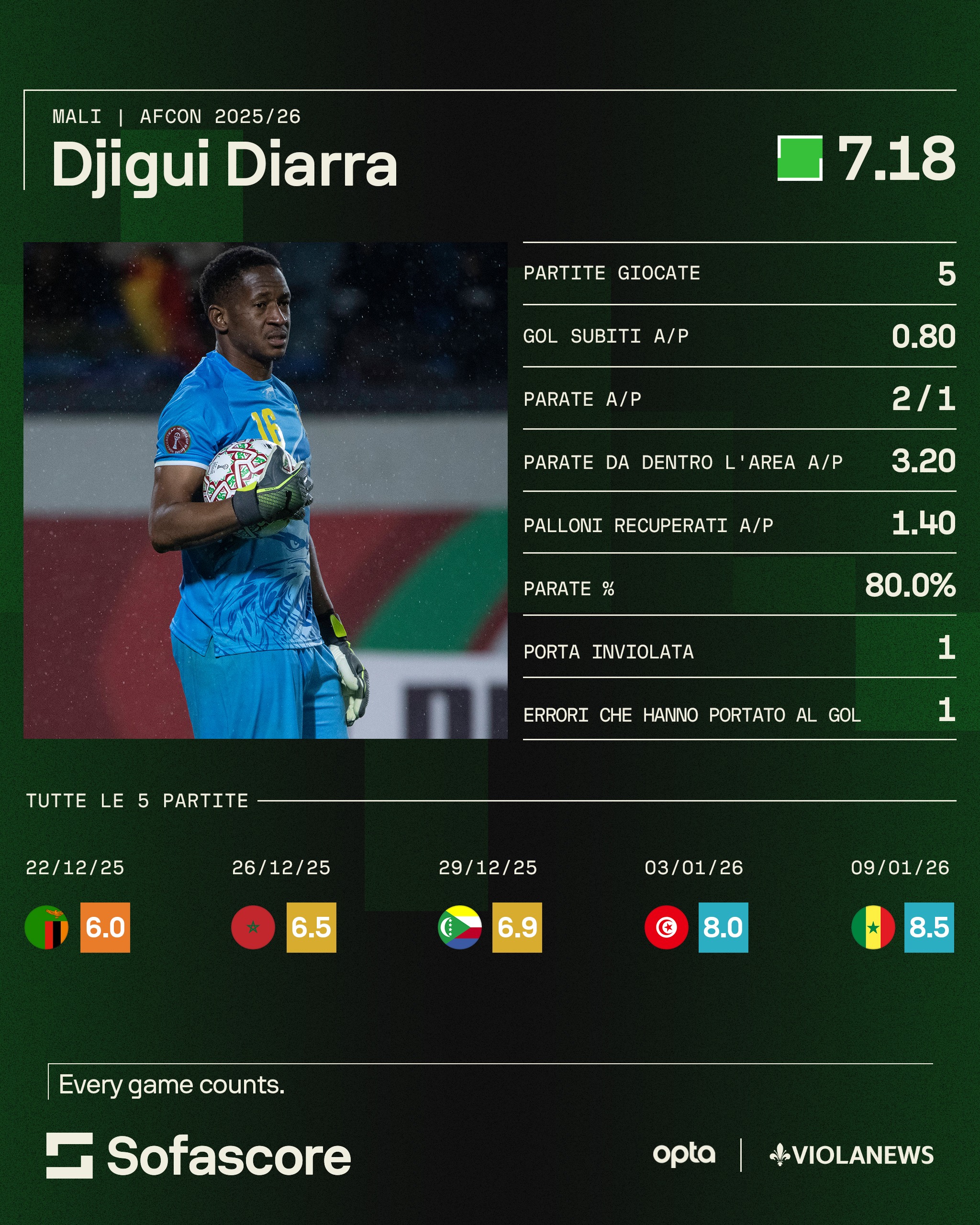 Non che la Fiorentina abbia bisogno di un portiere, tra De Gea oggi e Martinelli domani, né l'Africa è mai stata prolifica di grandi interpreti, ma tra Bounou e Mendy che giocano nella dorata Arabia Saudita segnaliamo volentieri il maliano Djigui Diarra: 30 anni, non giovanissimo ma nemmeno vecchio per la longevità propria del ruolo, gioca in Tanzania negli Young Africans e ha subito appena 4 reti in 5 partite, mai più di una in 90 minuti (solo all'esordio con lo Zambia è stato rivedibile sul gol di Daka), distinguendosi per i due rigori parati alla più quotata Tunisia, eliminata agli ottavi di finale, e per le parate che hanno evitato un passivo più pesante nell'eliminazione col Senegal. Un profilo come quello di Diarra sarebbe ideale come secondo, qualora ce ne fosse mai bisogno.
