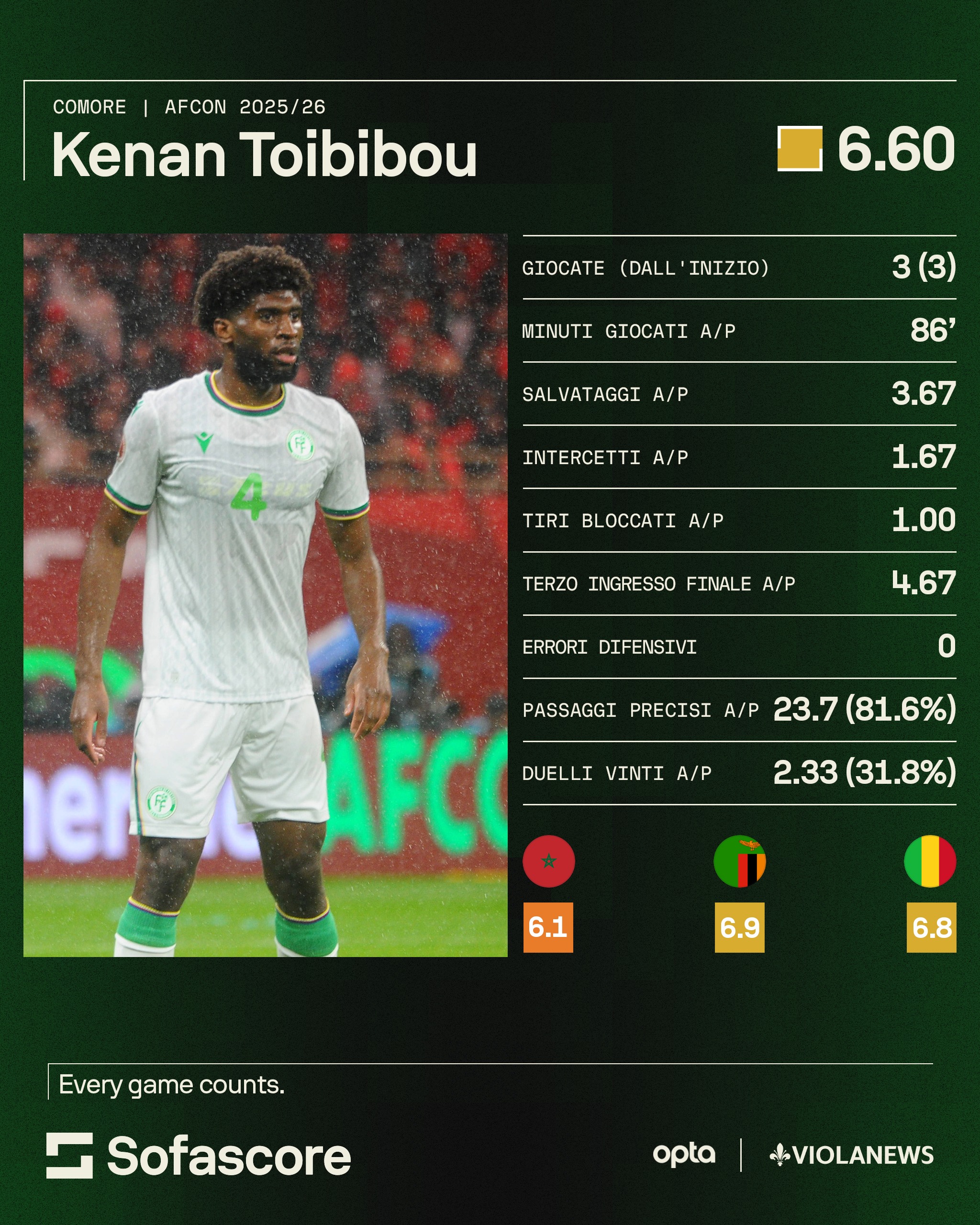 Qui potremmo sfruttare l'assist di Sportitalia e segnalarvi il camerunense Samuel Junior Kotto del Gent, in Belgio, ma ci spingiamo oltre e prendiamo il 2004 delle Isole Comore Kenan Toibibou: la Nazionale allenata dall'italiano Stefano Cusin ha fatto un figurone cedendo solo nella ripresa al Marocco e pareggiando le altre due partite per 0-0 contro Zambia e soprattutto Mali, una delle formazioni più attrezzate dopo le big. Toibibou, titolare fisso della sua rappresentativa a 21 anni, gioca in Slovenia, nell'NK Bravo, e come Diarra vale poche centinaia di migliaia di euro. Nella Fiorentina sarebbe un backup per Comuzzo, pronto a rendersi utile e a crescere ancora.