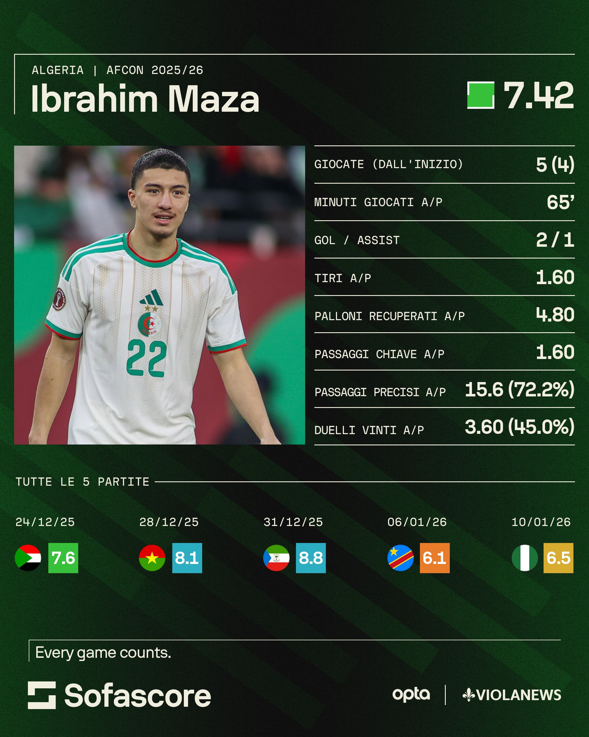Se per portiere e difensore ci siamo tenuti bassissimi col prezzo, è il momento di spingere sull'acceleratore dalla cintola in su, più per giugno che per gennaio: gli unici due nomi per i quali varrebbe veramente la pena fare un sacrificio nel mezzo, che non sono ancora talenti di livello mondiale ma che potrebbero presto diventarlo, sono Pape Gueye del Villarreal e Ibrahim Maza del Bayer Leverkusen. Ora, il senegalese l'avremmo messo volentieri anche per non fare una "coppia" con l'attaccante, ma si dà il caso che abbia deciso la finale di Rabat con il suo gol ai supplementari, il che immaginiamo farà schizzare il suo valore nell'immediato. Rimane il centrocampista algerino, classe 2005, trequartista o mezzala, ha fatto un lavoro eccellente in tutte le partite segnando due reti contro Sudan e Guinea Equatoriale. Costa parecchio, tra i 20 e i 30 milioni, è giovane e in rampa di lancio, ma la Fiorentina ha già speso cifre simili ultimamente e riteniamo che questo ragazzo del Bayer Leverkusen potrebbe meritarlo, e quindi andare a liberare Gudmundsson verso la fascia sinistra in maniera definitiva.