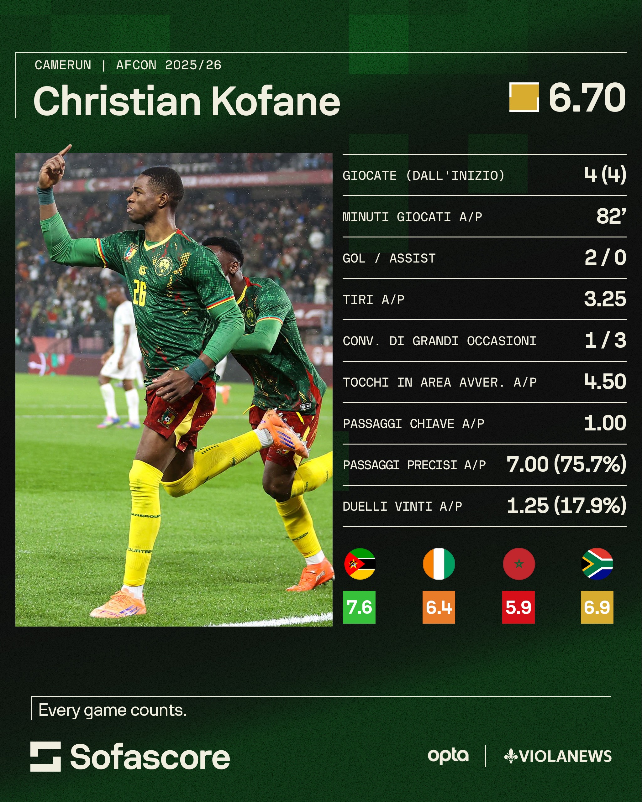 Se prima abbiamo parlato di "coppia" non è perché l'attaccante è algerino come Maza, sebbene Amoura abbia giocato un bel torneo al centro dell'attacco delle Volpi del Deserto; bensì perché anche il camerunense classe 2006 Christian Kofane è del Bayer Leverkusen, dunque lui e Maza sono compagni di club. Kofane, ad appena 19 anni, ha ricevuto il peso dell'attacco dei Leoni Indomabili sulle proprie spalle a causa dell'esclusione dai convocati di un certo Vincent Aboubakar, secondo miglior marcatore di sempre dietro solo all'attuale presidente federale Samuel Eto'o. C'è stata molta polemica, ma quel che conta è che Kofane ha avuto modo di brillare e ha segnato due reti, una al Mozambico nel girone e una decisiva per eliminare il forte Sudafrica agli ottavi. Il costo di questo ragazzo di 1,90m si aggira intorno ai 20 milioni, ma è destinato a salire presto. Potrebbe raccogliere il testimone di Kean e affiancare Piccoli in caso di cessione del primo a fine stagione, tramite la famosa clausola che si ripresenterà.