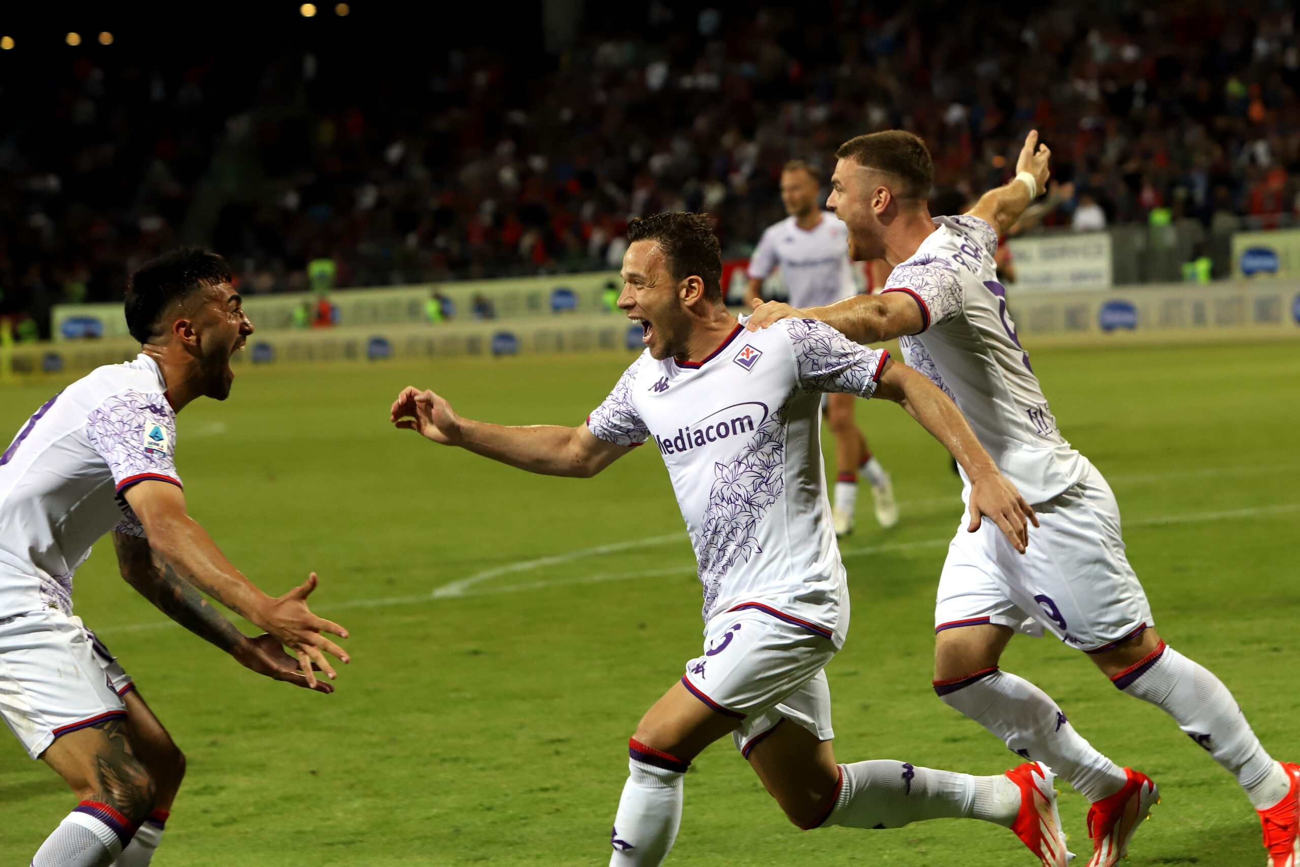 FLORENCE, ITALY - MAY 13: Head coach Vincenzo Italiano manager of ACF Fiorentina and Arthur Melo of ACF Fiorentina celebrate the victory after during the Serie A TIM match between ACF Fiorentina and AC Monza at Stadio Artemio Franchi on May 13, 2024 in Florence, Italy.(Photo by Gabriele Maltinti/Getty Images)