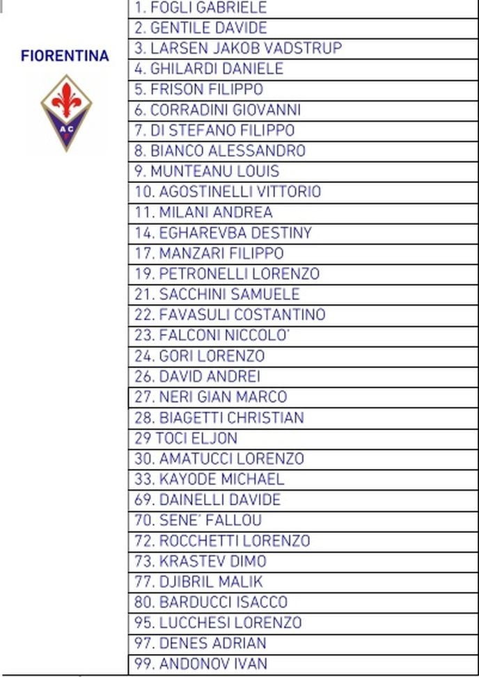 Sul sito ufficiale della Lega Serie A troviamo la numerazione completa delle squadre che partecipano al campionato di Primavera 1. Ecco le scelte dei giovani viola: Bianco, dopo un precampionato da protagonista, torna in pianta stabile agli ordini di Aquilani e sceglie la maglia numero 8. Altri due protagonisti del ritiro di Moena, Munteanu e Agostinelli, prendono rispettivamente 9 e 10. Scelte particolari per Krastev (n° 73), Andonov (n° 99) e altri giovani protagonisti della stagione che è appena iniziata