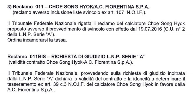 Continua a tenere banco il caso Choe negli uffici burocratici della FIGC e della Fiorentina (Clicca qui). Vi proponiamo l'estratto del comunicato della federazione che impone al club viola di reintegrare il giocatore nordcoreano nella formazione primavera.