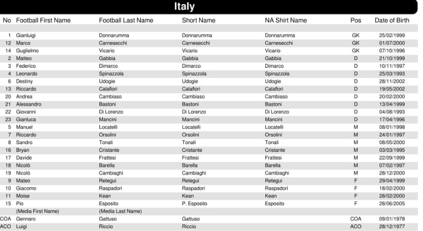 ITALIA (4-2-4) - Donnarumma; Di Lorenzo, Bastoni, Calafiori, Dimarco; Orsolini, Barella, Tonali, Raspadori; Kean, Retegui. Commissario tecnico: Gattuso.