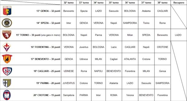 Speravamo di aver peccato di prudenza qualche settimana fa pubblicando questo articolo, purtroppo non è stato così. La Fiorentina dovrà sudarsi la salvezza nelle ultime sette gare di campionato, scenario che in pochi avrebbe immaginato dopo la vittoria di Benevento. Al 30 marzo avevamo preso in considerazione tutte le squadre dall'Udinese in giù, ma stavolta ci sentiamo di escludere i friulani, praticamente già salvi dopo l'ultima vittoria in campionato. Praticamente già spacciate Crotone e Parma, alle quali servirebbe un miracolo per evitare la retrocessione in Serie B. Tutte pienamente coinvolte le sei squadre che si trovano in mezzo: si va da chi può permettersi di gestire un vantaggio non di poco conto, come Genoa e Spezia, a chi si trova in una situazione molto più preoccupante come Cagliari, Benevento e Fiorentina (ancora da decifrare quella del Torino, in grande crescita nelle ultime uscite e con una gara da recuperare).