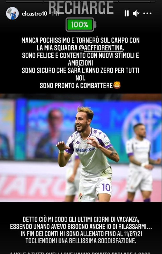 Queste le parole tratte dalle storie Instagram di Castrovilli: "Manca pochissimo e tornerò sul campo con la mia squadra, la Fiorentina. Sono felice e contento, con nuovi stimoli e ambizioni. Sono sicuro che sarà l'anno zero per tutti noi. Sono pronto a combattere. Detto ciò, mi godo gli ultimi giorni di vacanza, essendo umano avevo bisogno anche io di rilassarmi... in fin dei conti mi sono allenato fino al 11/07/2021 togliendomi una bellissima soddisfazione. A voi e a tutti quelli che hanno dovuto parlare a caso. FORZA VIOLA".