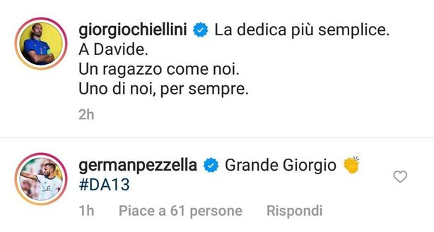 Il bellissimo gesto di Giorgio Chiellini, che ha dedicato la vittoria all'Europeo a Davide Astori durante la cerimonia dal presidente Mattarella, ovviamente non è passato inosservato, anche e soprattutto nel mondo viola. Poco fa il capitano della Nazionale azzurra ha ribadito il concetto con un post su Instagram ed è intervenuto anche, tra i commenti, colui che porta al braccio la fascia di Davide. L'argentino German Pezzella, anche lui fresco campione continentale dall'altra parte del mondo, ha ringraziato Chiellini con un semplice ma efficace "Grande Giorgio".