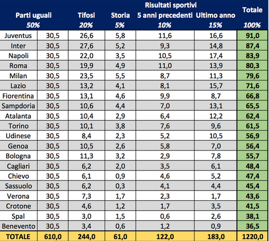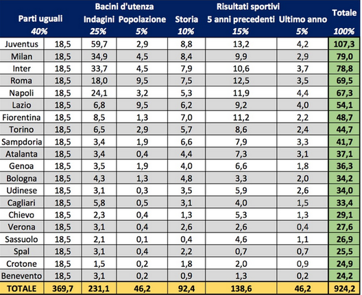 Dal valore complessivo dei diritti tv annuali vanno tolti alcuni elementi: basandoci sulla stima effettuata dalla Gazzetta dello Sport per la stagione 2015/16, abbiamo tolto dal totale circa 50 milioni di commissione per Infront, successivamente il 10% per la mutualità, poi 60 milioni per il paracadute e circa 20 milioni tra premi per la Coppa Italia e altri versamenti per la Serie B. Il totale - scrive Calcio e Finanza - si aggirerebbe, quindi, sull’1,2 miliardi di euro, contro i circa 924 milioni di euro attuali: un aumento, quindi, pari a circa 300 milioni di euro annui.