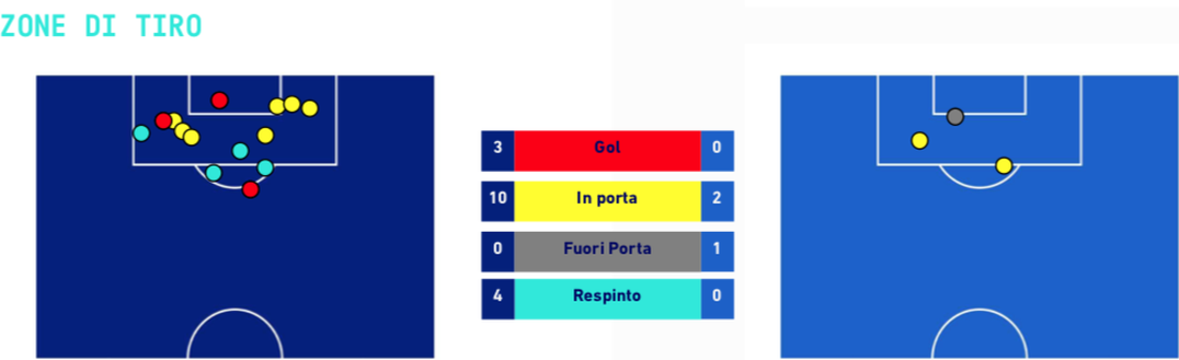 L’Atalanta ha costruito 9 azioni da gol, la Fiorentina soltanto una. I tiri totali sono stati 14 per i padroni di casa, di cui 10 nello specchio della porta. 3 per gli ospiti, 2 in porta. 4 le conclusioni create dagli orobici respinte, nessuna per quanto riguarda la formazione gigliata. Calci d’angolo: 11 a 2 per i bergamaschi; passaggi riusciti: 428 l’Atalanta, 347 la Fiorentina; palloni giocati in avanti riusciti: 243 a 148 per gli uomini di Gasperini. Capitolo chilometri: l’Atalanta ne ha percorsi 113.249, la Fiorentina 110.549. Il podio è composto da Pessina (12,37 km), Freuler (11,70 km) e Hateboer (11,54 km) da una parte e da Amrabat (11,71 km), Bonaventura (11,38 km) e Pezzella (10,89 km) dall’altra. Concludiamo con le zone di tiro (blu scuro= Atalanta; blu chiaro=Fiorentina): lo screenshoot qui sotto è emblematico, non serve aggiungere altro. Numeri desolanti. E l’Atalanta non aveva né Ilicic, né Gomez.