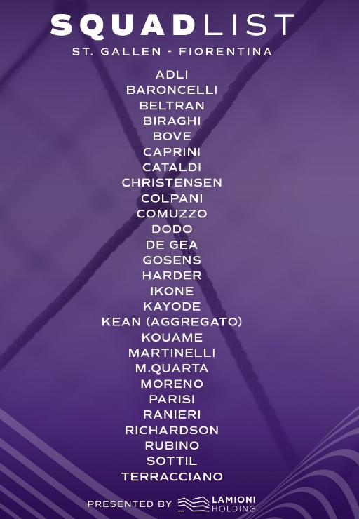 È appena stata diramata la lista dei convocati da parte di Palladino per la sfida di giovedì alle 18:45 con il San Gallo. Confermate le assenze di Gudmundsson, Pongracic e Mandragora. Tanti i giovani della primavera convocati da tecnico campano. Ma la sorpresa è su Moise Kean, che nonostante il problema accusato a Lecce è regolarmente presente in lista. L'attaccante è aggregato con la squadra. Nell'elenco c'è anche il portiere Christensen, nonostante il danese sia fuori dalla lista Uefa. Verrà solamente per allenarsi insieme ai compagni.