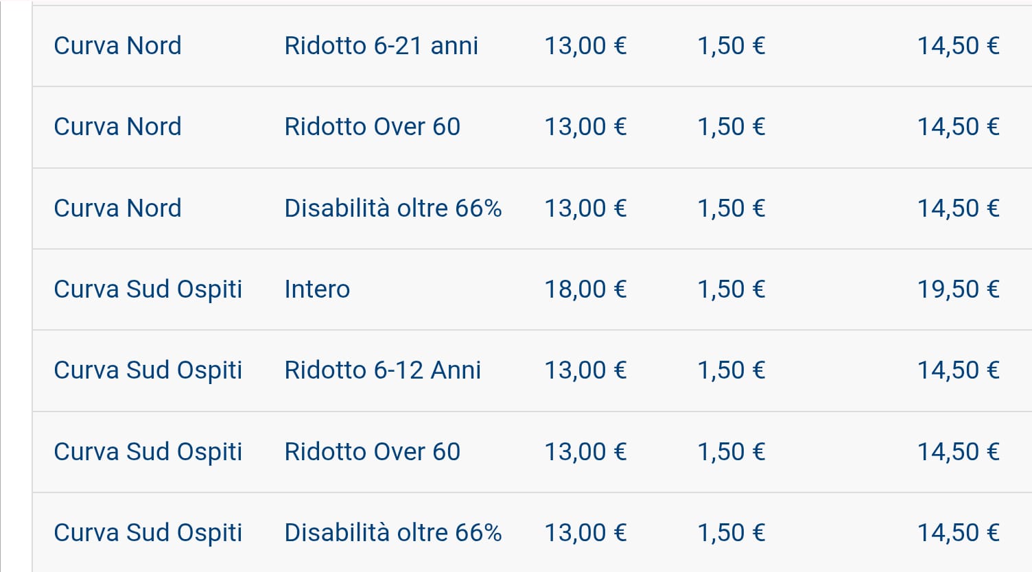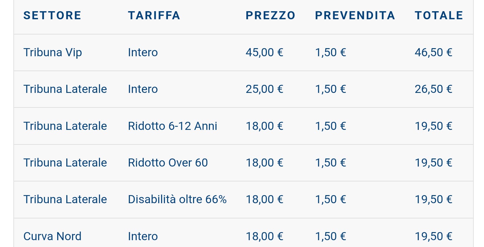 Il costo dei tagliandi varia da un minimo di 14.50 euro (per le persone affette da disabilità per oltre il 66%), ad un massimo di 46.50 euro per la Tribuna Vip. Il costo minimo del biglietto intero è di 19.50 euro. In basso vi proponiamo la tabella dei prezzi completa:
