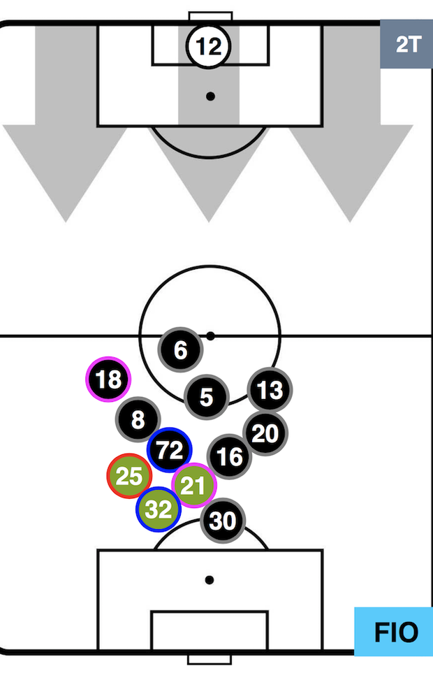 Detto del primo (l'equilibrio) che Sousa non ha dato con gli undici in campo, vi mostriamo due grafici con la posizione dei calciatori viola e rosanero nel secondo tempo. Ecco qui sotto la Fiorentina disposta a grappolo in fase di possesso senza il minimo sfruttamento delle fasce laterali e senza un criterio tattico ben definito.