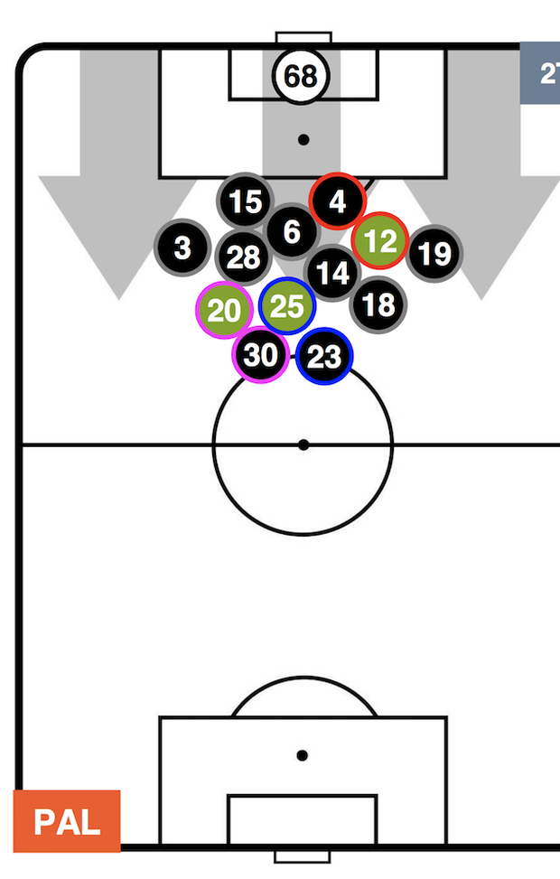 Una disposizione simile facilita il compito di chi si vuole difendere, tanto è vero che il Palermo in fase di non possesso si è schierato così tutto schiacciato davanti all'area di rigore