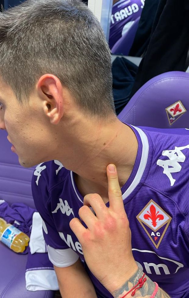 Ecco una foto esemplificativa che mostra il collo di Martinez Quarta dopo essere stato strattonato da Lukaku sul gol dell'1-2.