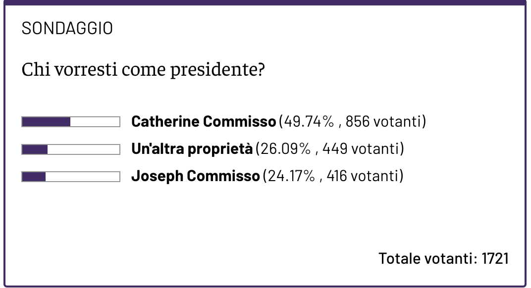 Vi abbiamo chiesto, nella giornata di oggi, quale fosse la vostra preferenza per la successione sulla poltrona più alta di ACF Fiorentina, tra Joseph, Catherine Commisso oppure un cambio abbastanza repentino con l'ingresso di una nuova proprietà. Ecco i risultati del sondaggio, che vedono la maggioranza per Catherine, quasi al 50%. Mentre viaggiano a pari merito il figlio Joseph e una nuova proprietà